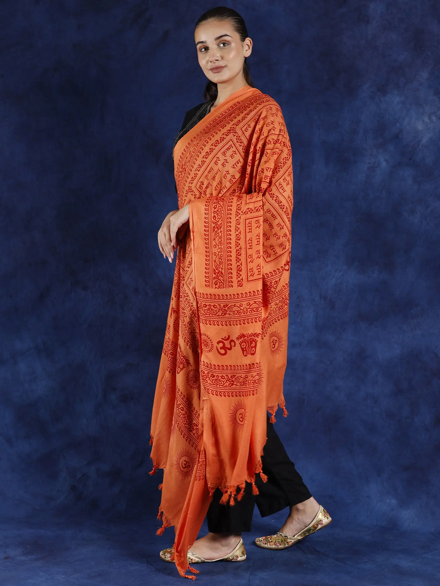 This shawl from Banaras with the sacred mantra “Hare Ram Hare Krishna” unfolds a tapestry of heavenly artistry. This shawl is a tribute to spirituality, intricately embroidered with vivid colors and wonderful designs. Its delicate touch, woven from the finest poly cotton, is a gateway to peace. Feel the warm embrace of tradition and prayer as you drape it.