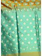 The striking contrast between the warm harvest-gold and the cool emerald green creates a visual harmony that is both sophisticated and eye-catching. The paisley motifs, a quintessential element of Indian textile art, are strategically placed to create a sense of depth and movement across the sari. The pallu and border of the sari are adorned with a complementary green hue, featuring delicate floral patterns and shimmering gold accents that add an extra layer of opulence. This thoughtful interplay of colors and designs makes this sari a true work of art, perfect for making a memorable statement.