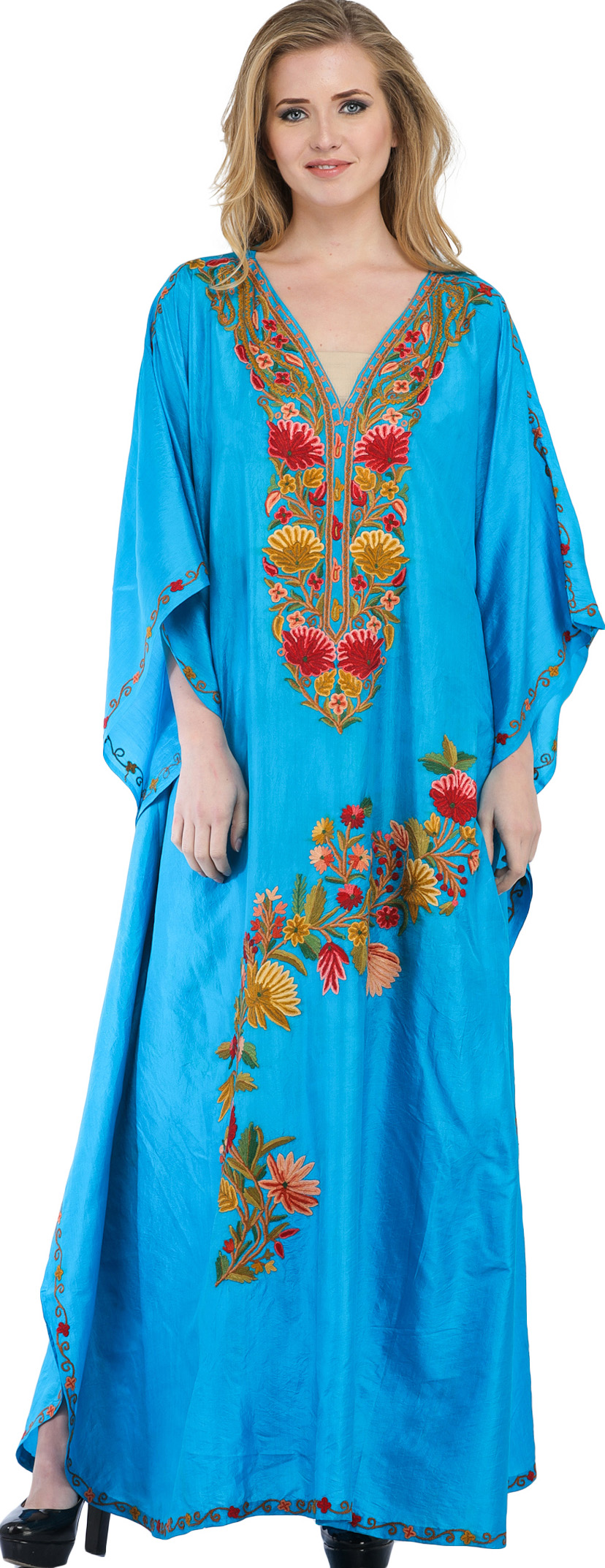A floor-length robe of loose, flowy beauty, this Kashmiri kaftan is almost ethereal. The shimmering azure of the foundation silk fabric brings out the rich pastels of the petalled foliage in the foreground. The style of embroidery done densely along the bust, along the edge of the fairy sleeves and the hemline, and across the skirt of the dress is a kind of crewel-work endemic to the tumultuous Indian valley.