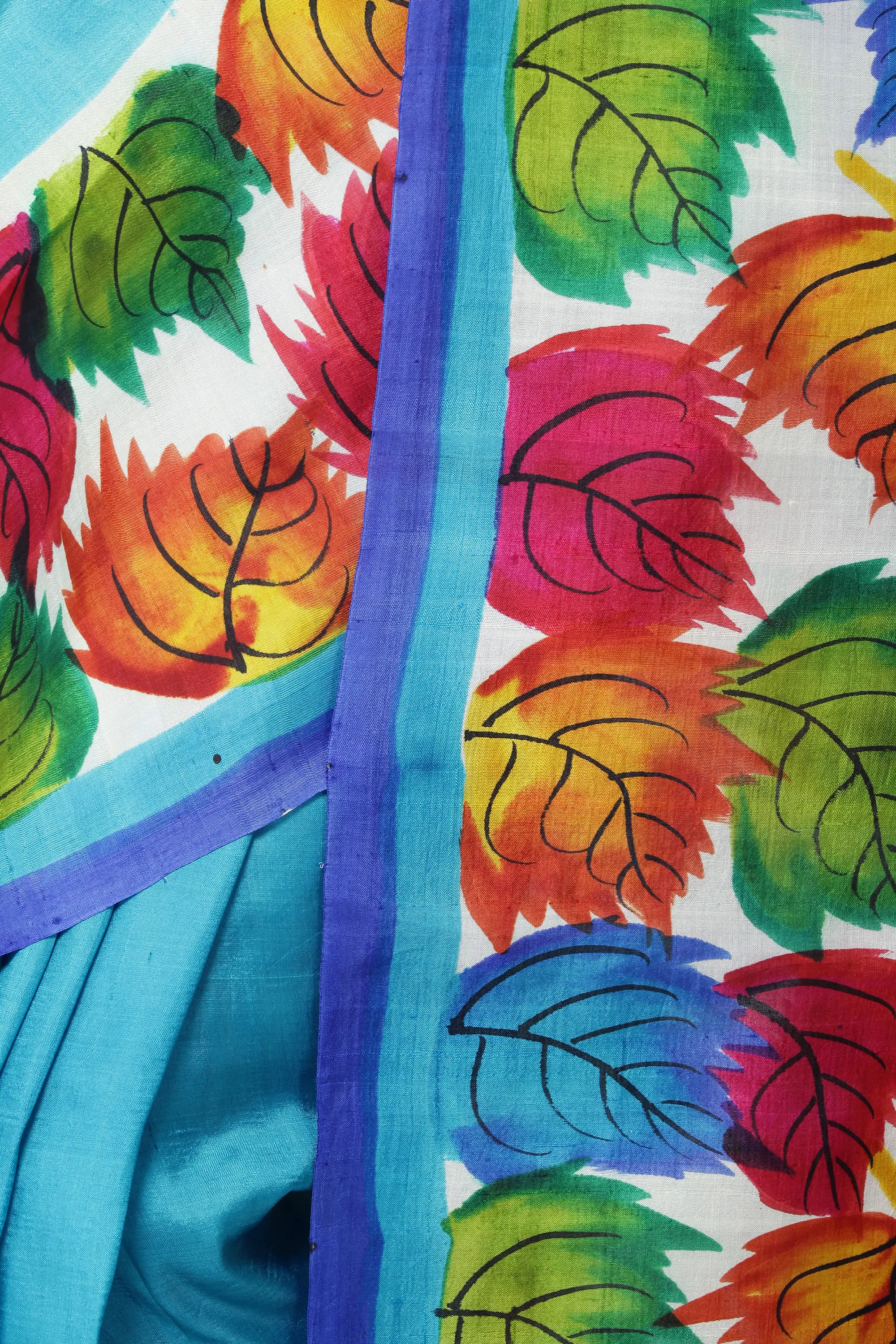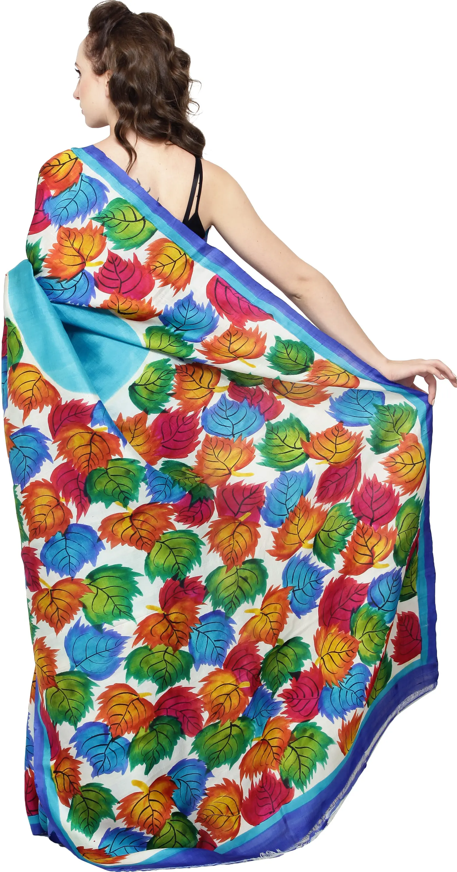 Hawaiian-Ocean Printed Saree from Kolkata with Multi-Color Leaves on Border and Pallu