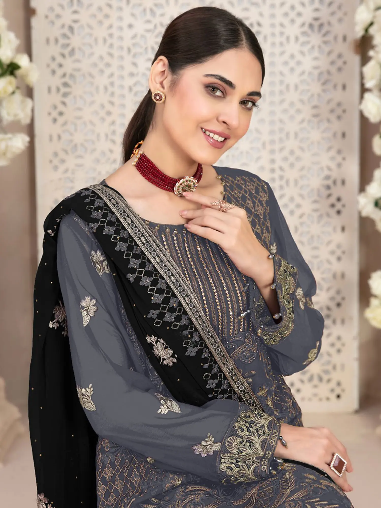 The kurta is the centerpiece of this stunning outfit, featuring elaborate embroidery that showcases the skill and dedication of the artisans. Shimmering sequins are meticulously placed to catch the light, adding a touch of glamour and sparkle. The intricate patterns gracefully adorn the georgette fabric, creating a mesmerizing visual texture. From the neckline to the hem, every detail has been carefully considered to ensure a luxurious and refined finish. The full sleeves are adorned with intricate border along the edge of the wrist that matches the border on the bottom edge of the kurta.