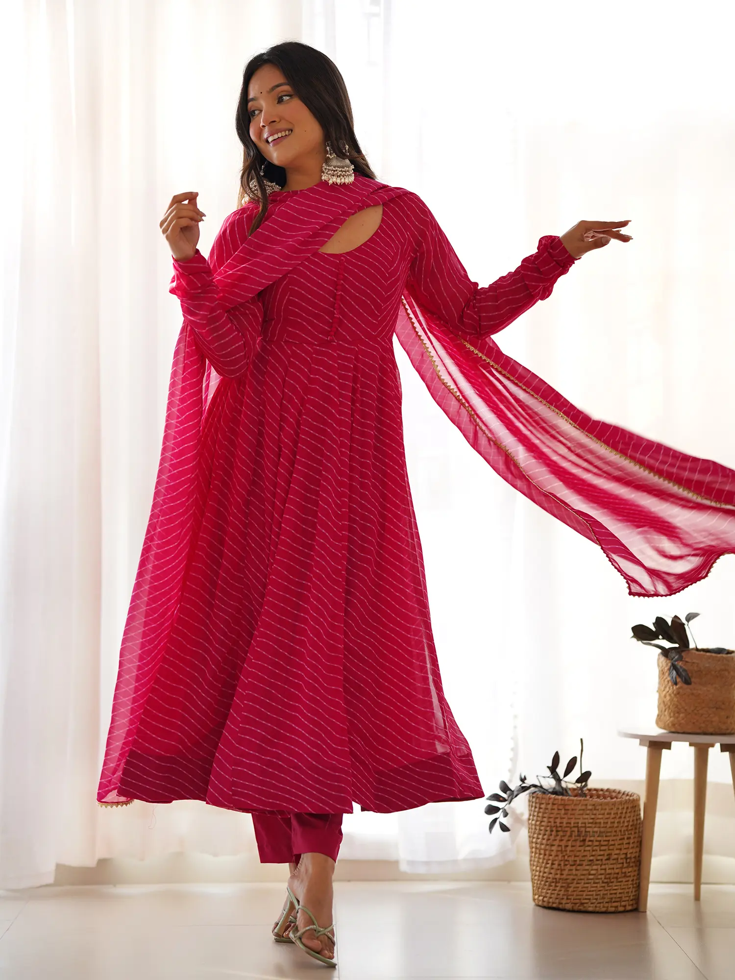 Completing this captivating ensemble is a matching dupatta, also fashioned from the same delicate faux georgette. It mirrors the Anarkali's enchanting Leheriya print, creating a harmonious and cohesive look. The dupatta is generously sized, allowing for various styling options – drape it elegantly over your shoulders for a classic touch, or let it flow freely to enhance the overall drama of the outfit. The fine border detailing adds a subtle sparkle, catching the light and adding another layer of refined detail. This dupatta is not merely an accessory; it is an integral part of the story, enhancing the grandeur and elegance of the entire Anarkali suit.