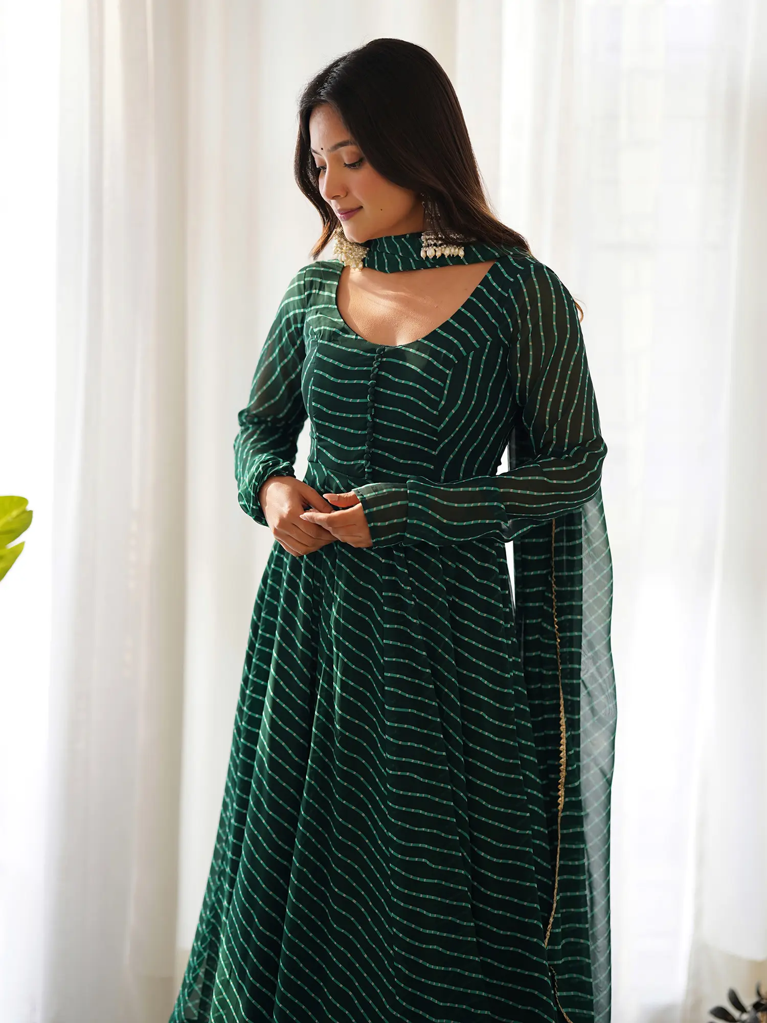 Elegance Redefined: The Forest Green Leheriya Anarkali Ensemble