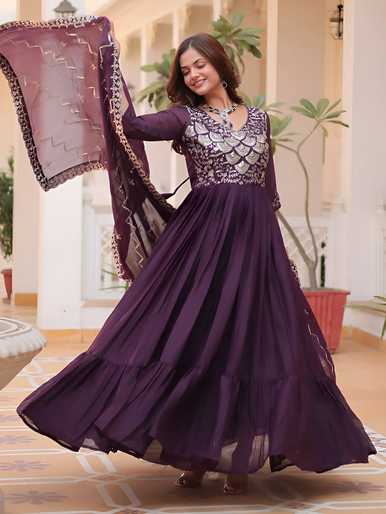 Crafted from high-quality georgette fabric, this gown drapes beautifully, creating a soft and ethereal effect. The flowing skirt adds movement and volume, enhancing its overall elegance. The addition of a matching dupatta complements the gown perfectly, allowing you to style it in various ways to suit your personal taste. The flared bottom adds a touch of playfulness to an otherwise sophisticated design.