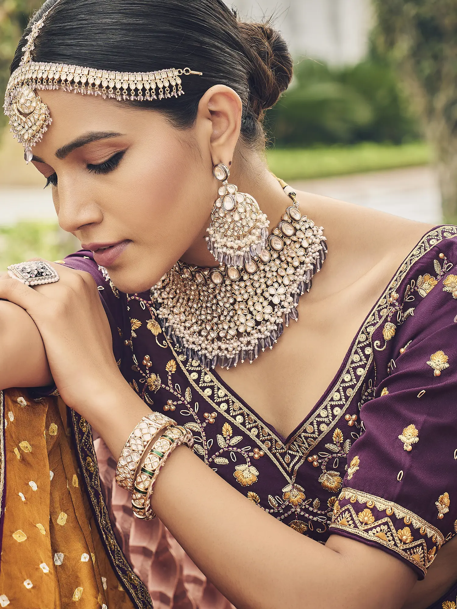 Covered in the regalia of deep wine, this heavy viscose designer lehenga is a traditional showstopper. The blouse displays a rich floral mesh or Jaal, inspired by the classic Indian textiles, and the gorgeously voluminous lehenga boasts traditional rows of embroidery ending in an ornate hemline, where golden threads create intricate floral and geometrical patterns derived from the attire of medieval queens. The look is tied together by the classic folk allure of Bandhani, whose typical bundi or dot patterns on the contrasting dupatta make this an unforgettable ensemble.