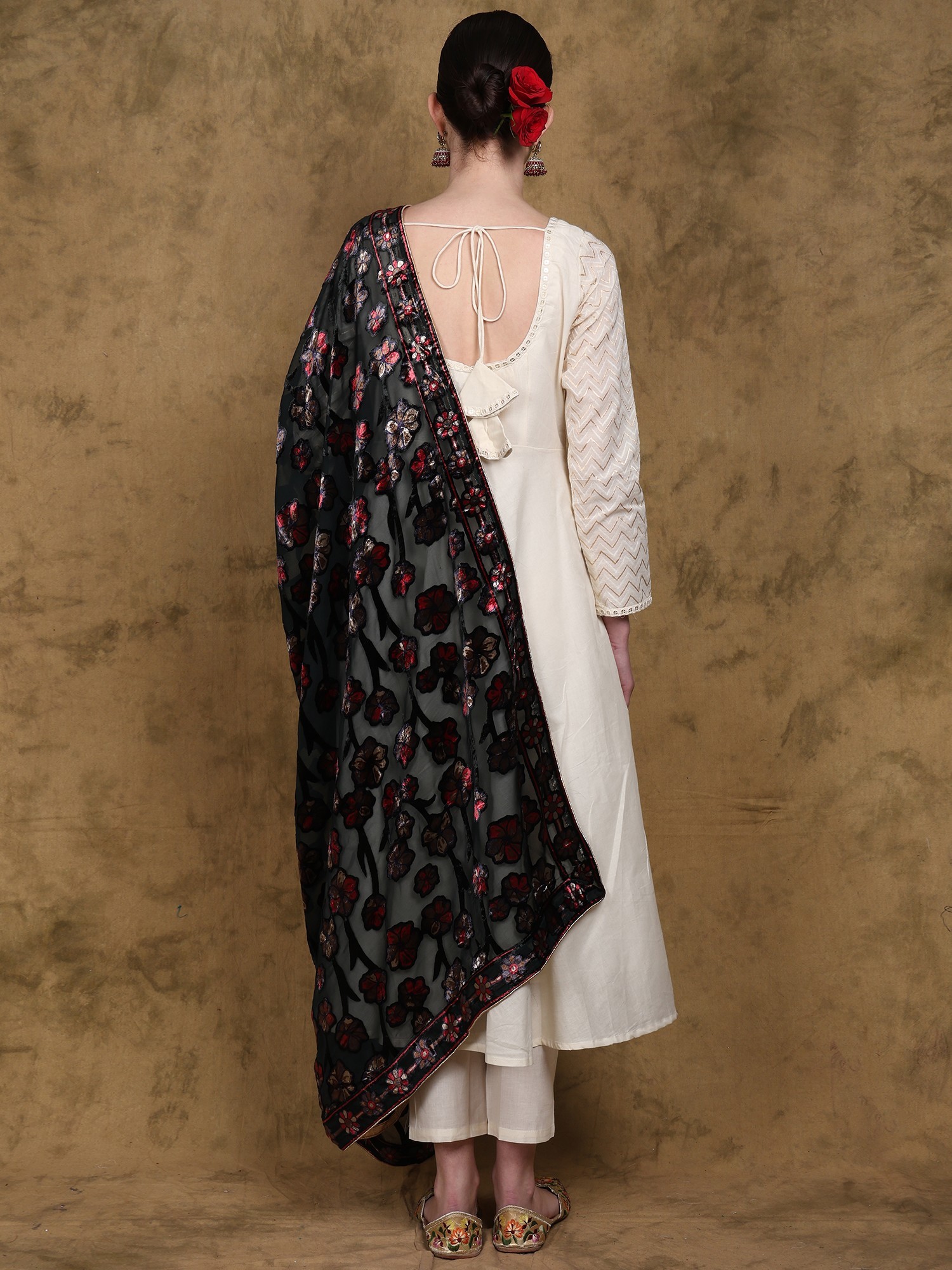 Drape yourself in luxury with our exquisite Green-Gables Hibiscus Floral Pattern Brasso Velvet Dupatta, a masterpiece crafted in the heart of Amritsar. This isn't just a dupatta; it's a statement piece, an embodiment of timeless elegance and sophisticated style. The rich, deep black brasso velvet forms the perfect backdrop for the intricately embroidered hibiscus flowers, their delicate petals bursting with a captivating mix of colours. The meticulous detailing elevates this dupatta to a work of art, transforming any ensemble into something truly special. Imagine the way the light catches the velvet, adding depth and dimension to the already stunning floral pattern. The luxurious feel against your skin will leave you feeling pampered and confident.