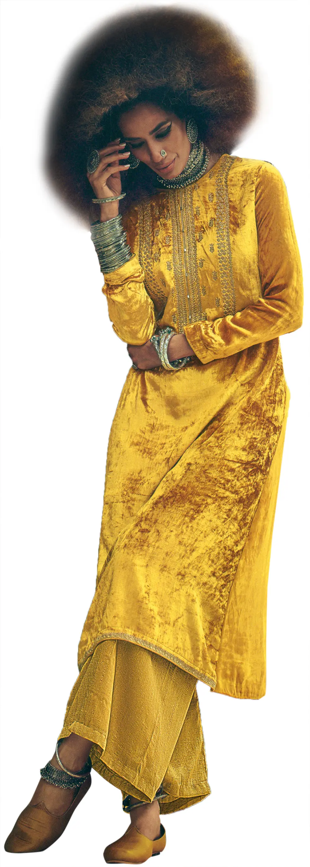 Complementing the elegantly embroidered kameez are the gracefully flowing palazzo pants. Designed with a contemporary sensibility, these wide-leg trousers offer exceptional comfort without compromising on style. The generous cut allows for unrestricted movement, making them ideal for extended wear at festive gatherings, weddings, or cultural events. The rich honey-yellow of the pants seamlessly blends with the kameez, creating a harmonious and elongated silhouette that is both flattering and chic.