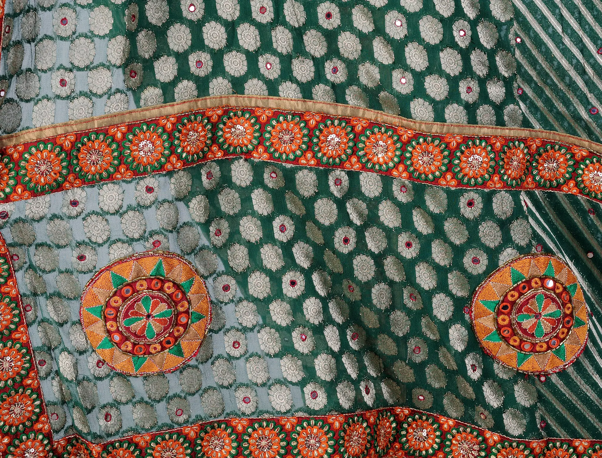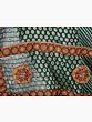 The lush green, intertwined with accents of red and orange, dances gracefully as symbols of auspiciousness and fertility. Geometric patterns grace the fabric, weaving a tale of intricate beauty. Adorned with mirror work and a patch border, the chiffon sari evokes timeless elegance, reminiscent of age-old customs. The amalgamation of colors, patterns, and craftsmanship captures the essence of celebration and heritage. Wrap yourself in this masterpiece, where every thread narrates a story of tradition and vibrancy, making your special moments truly unforgettable.