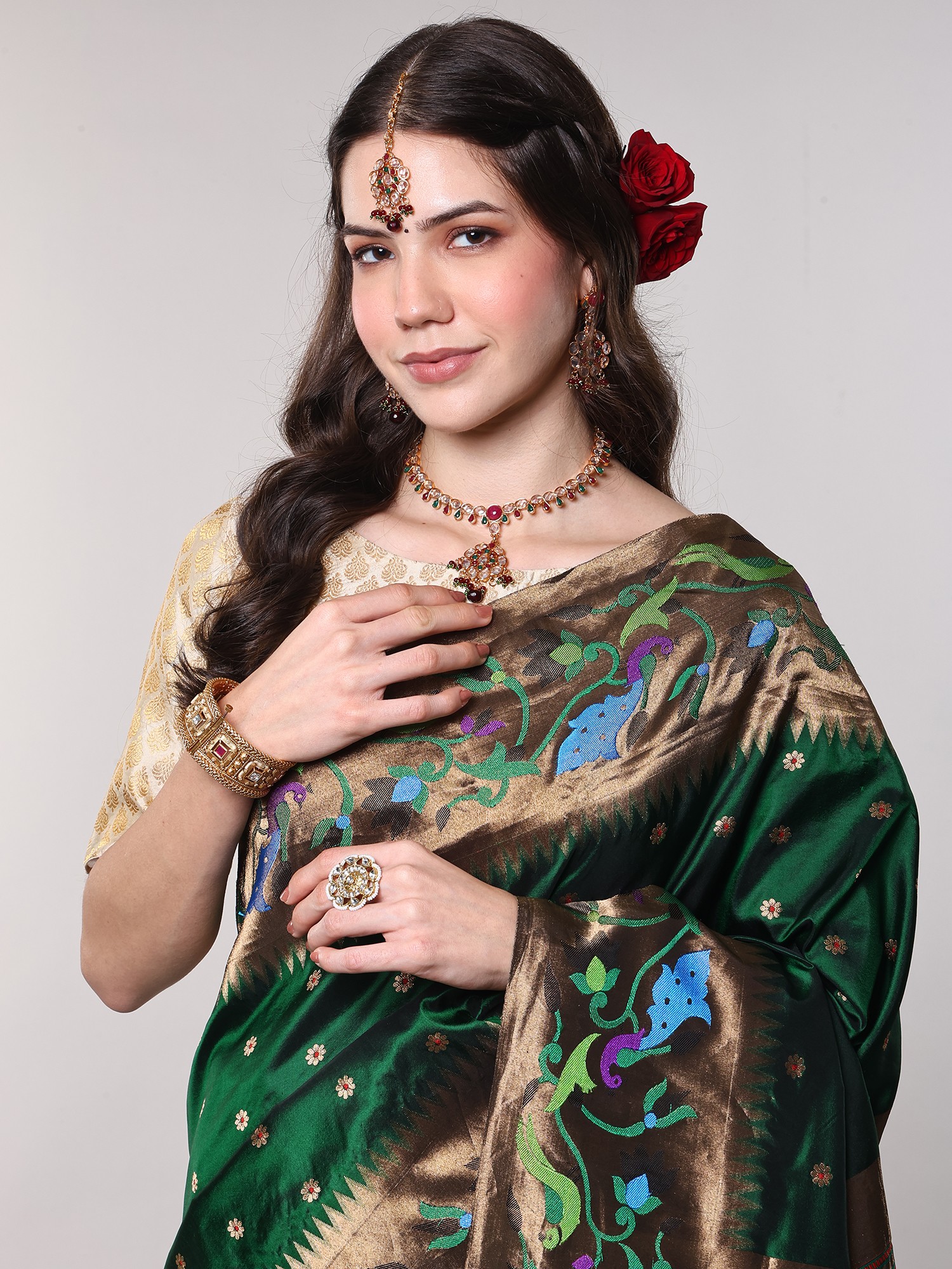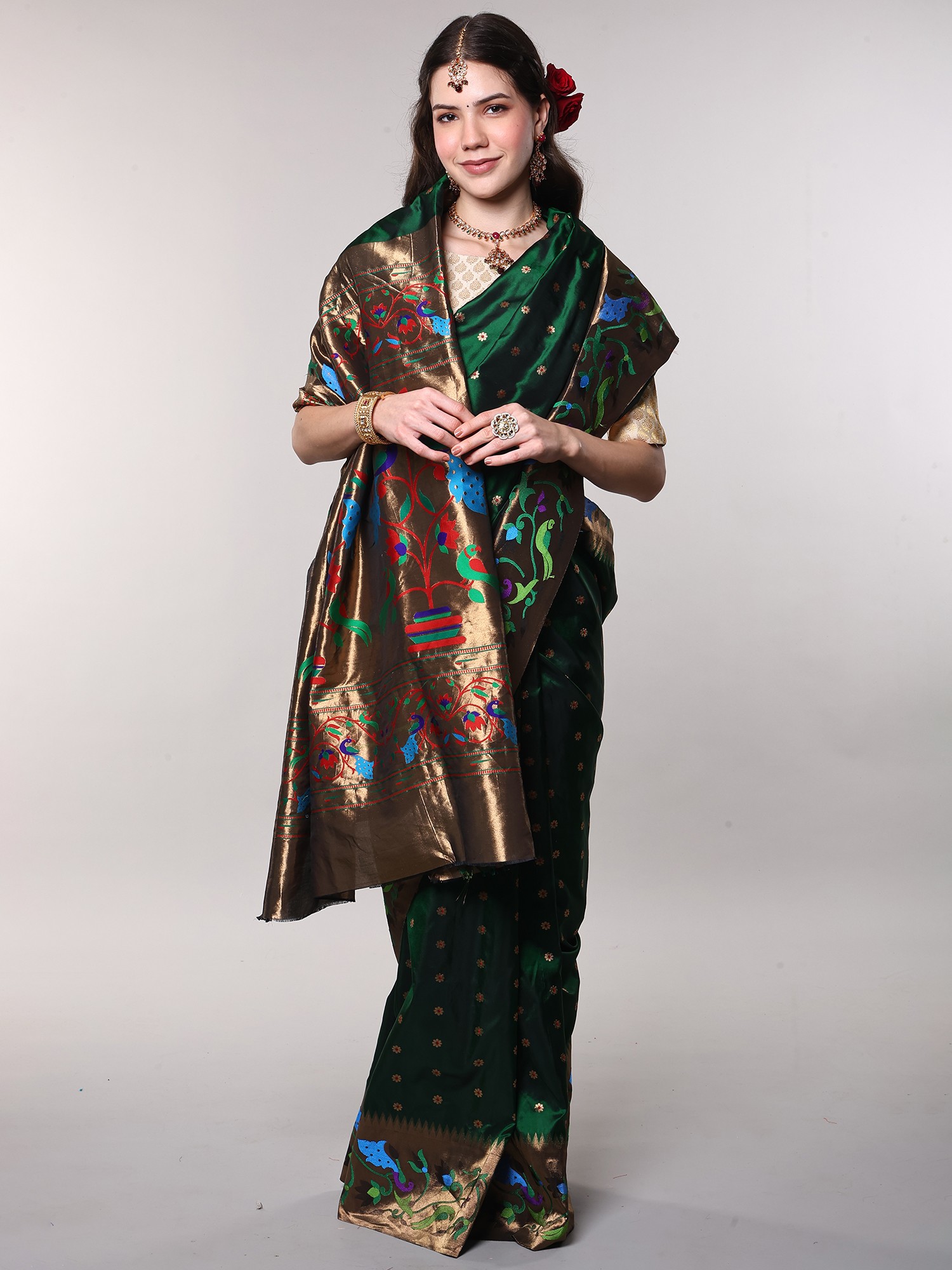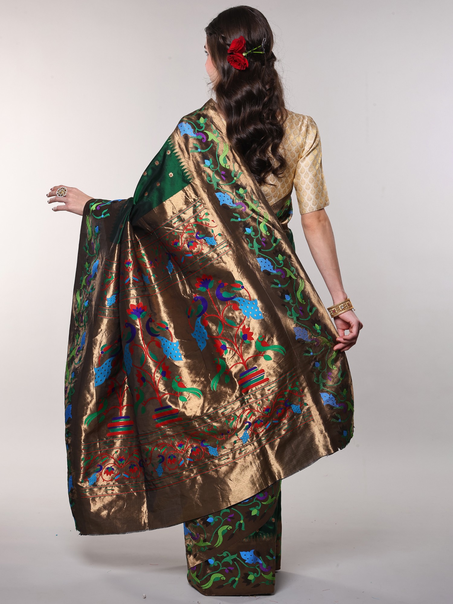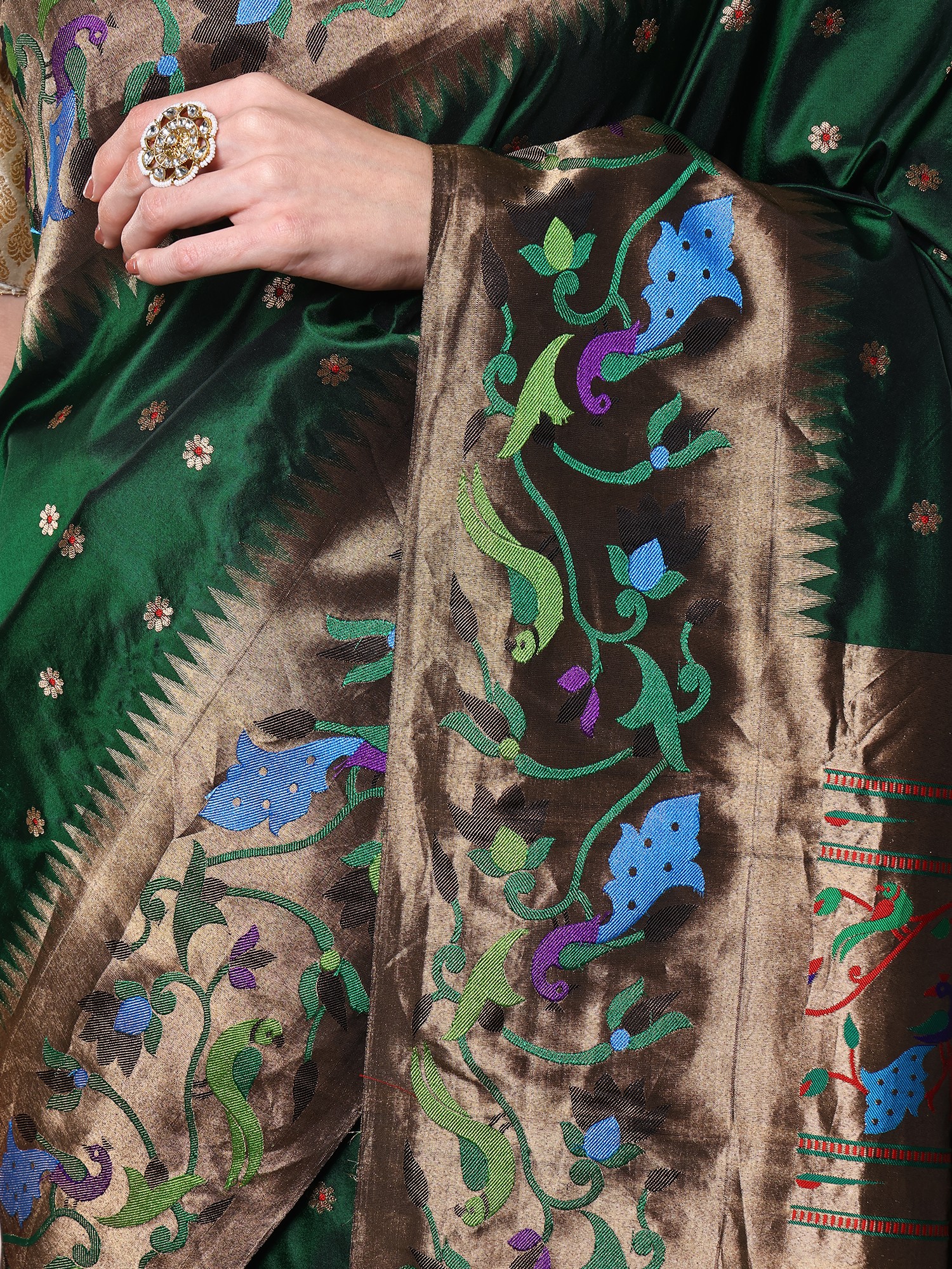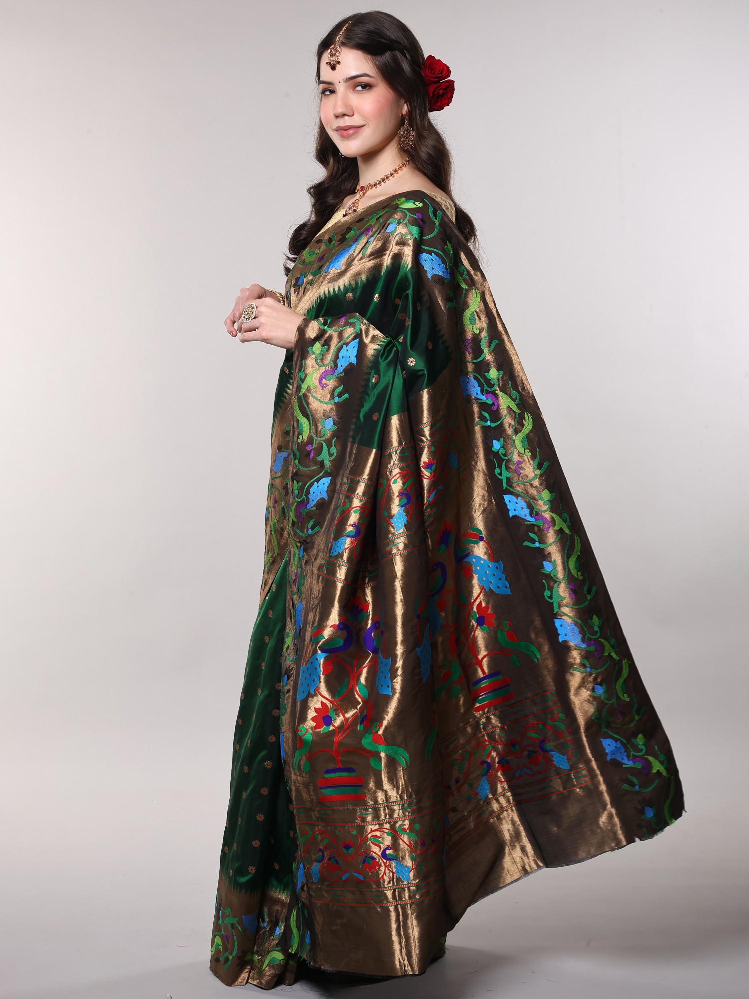 Hunter-Green Pure Silk Bootis woven Paithani Saree with Intricate Golden Thread work and Parrot Border from Bangalore