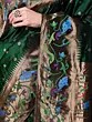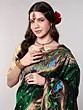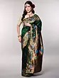 The body of the saree is adorned with delicate bootis, woven with shimmering golden threads that catch the light with every movement. These small, ornate motifs are scattered across the rich green silk, creating a subtle yet captivating texture. The true showstopper, however, is the magnificent parrot border. This expansive border is a riot of color and detail, featuring intricately woven parrots amidst scrolling vines and floral elements. The golden threads are masterfully employed to highlight the fantastical creatures and lush foliage, lending a regal and enchanting aura to the entire drape. The rich contrast of the emerald green silk with the warm golden threads and vibrant pops of color in the border creates a visually stunning masterpiece.