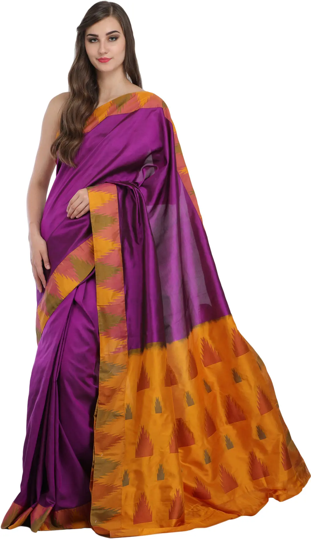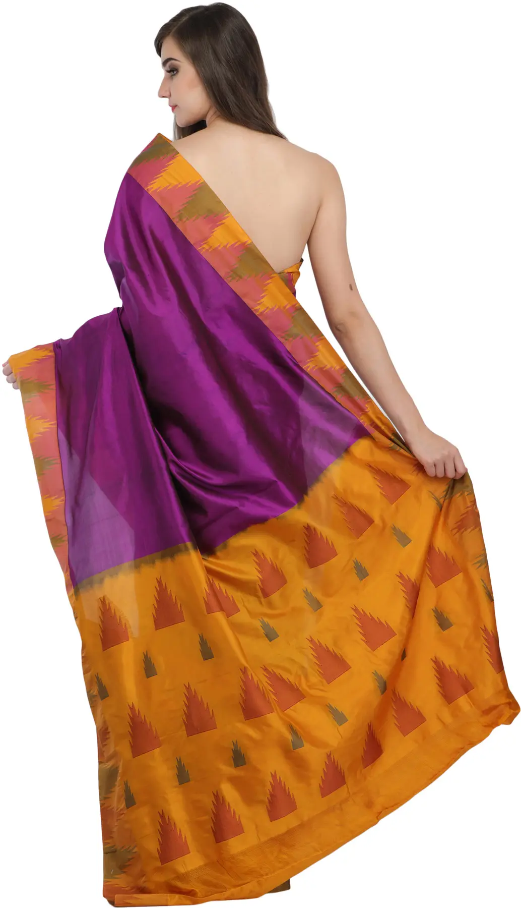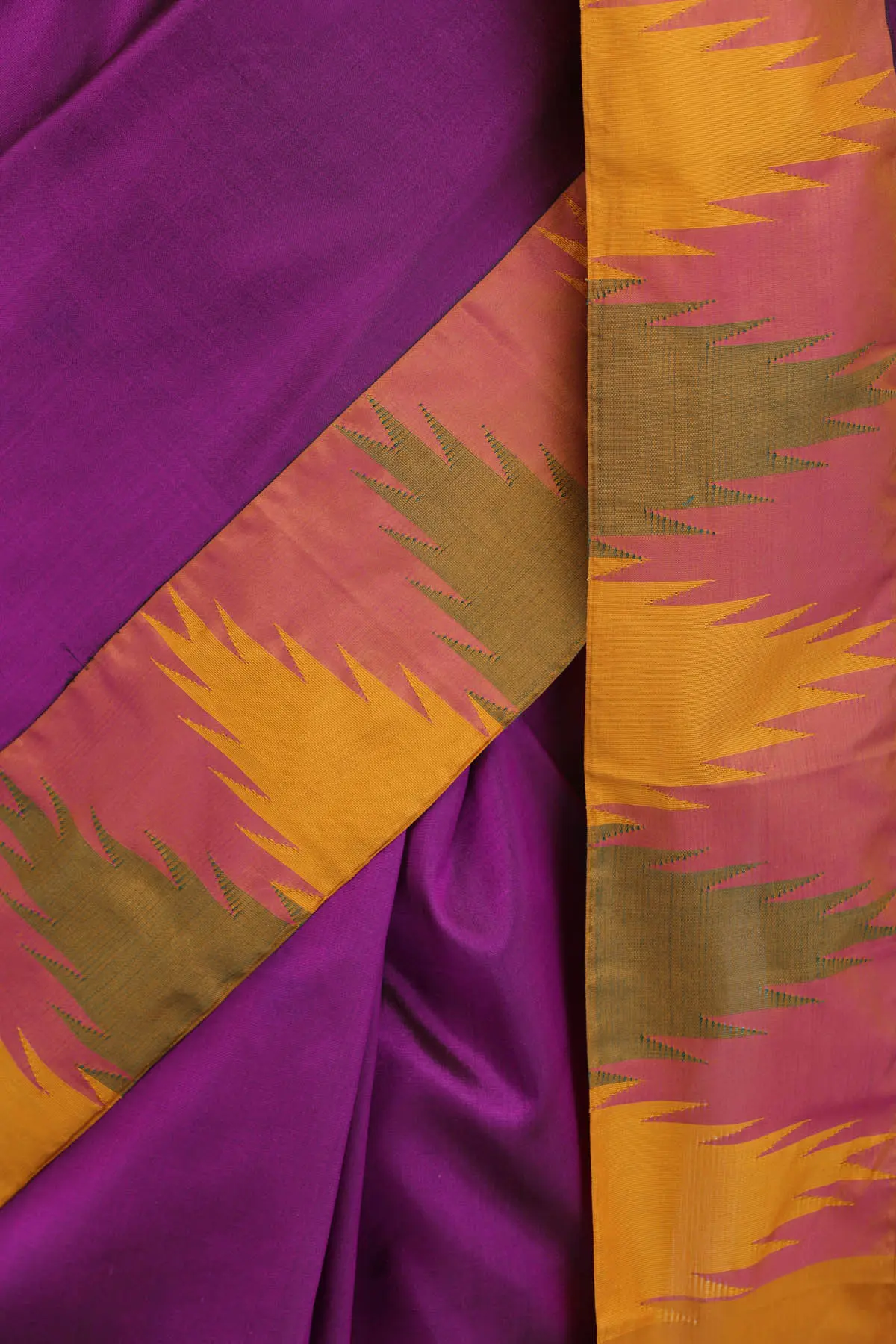 The traditional choice of color, hyacinth-violet, and the temple woven border pay homage to India's rich cultural heritage. This classic drape, adorned with timeless motifs like the temple design, offers a pure silk experience that feels as luxurious as it looks. It's more than just clothing; it's a celebration of tradition and an ode to timeless beauty, allowing you to embody the grace of a blooming flower with every wear.