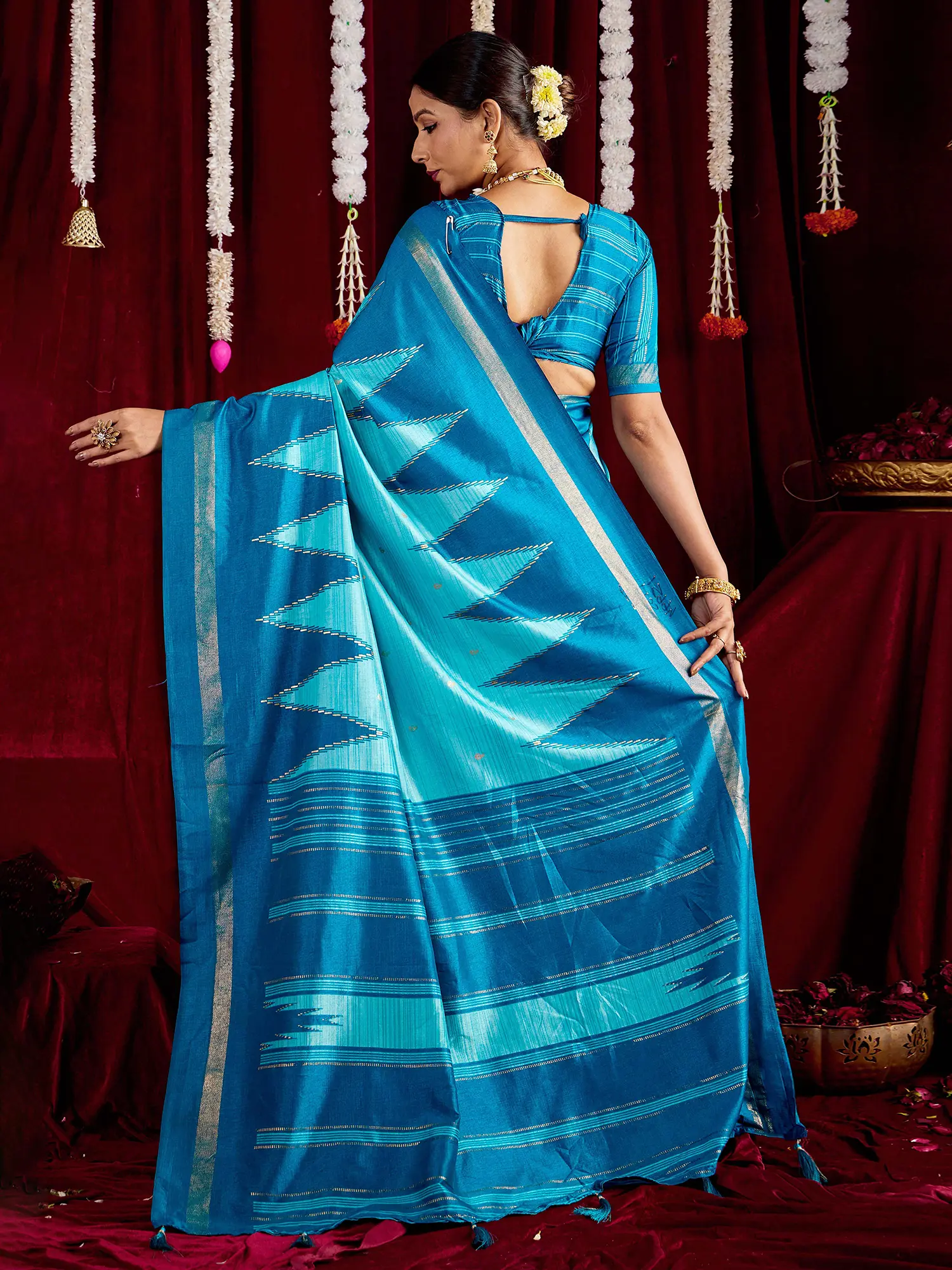 You'll be captivated by the striking zig-zag print, a modern interpretation of a classic motif that adds a dynamic visual appeal. The rich, warm hues of the silk create a sophisticated contrast, highlighted by subtle metallic threads that shimmer with every movement. The generous length allows for graceful draping, while the accompanying blouse fabric can be tailored precisely to your measurements for a perfect, personalized fit.