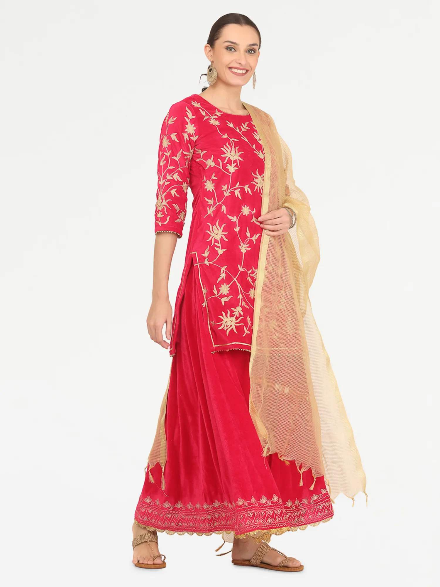 Festive Pink Velvet Kurti Sharara Set With Floral Embroidery And Chanderi Dupatta Indian Ethnic Dress