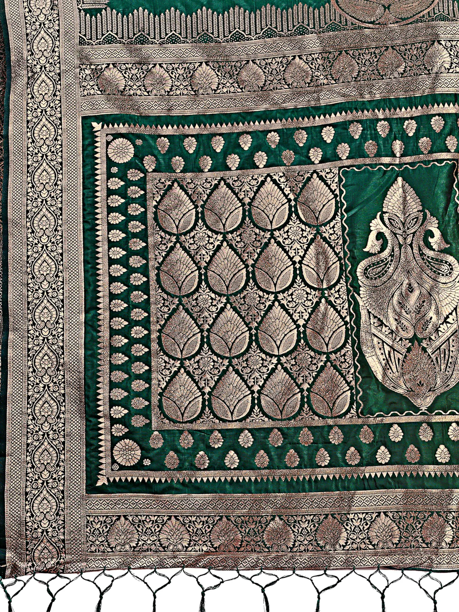 The rich, deep hue of the silk serves as a perfect canvas for the opulent golden Zari work, creating a striking contrast that commands attention. The expansive designer border provides a dramatic frame, showcasing elaborate motifs that speak of grandeur and sophistication. The pallu, finished with elegant latkans, adds a final touch of refined detail, ensuring a flawless presentation from every angle.