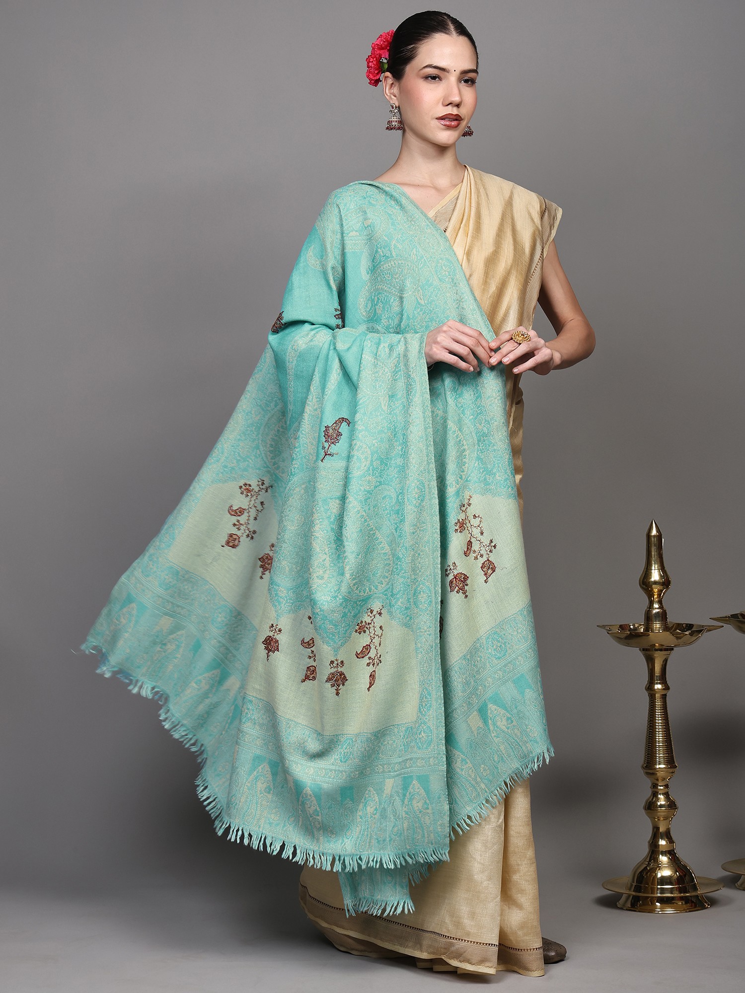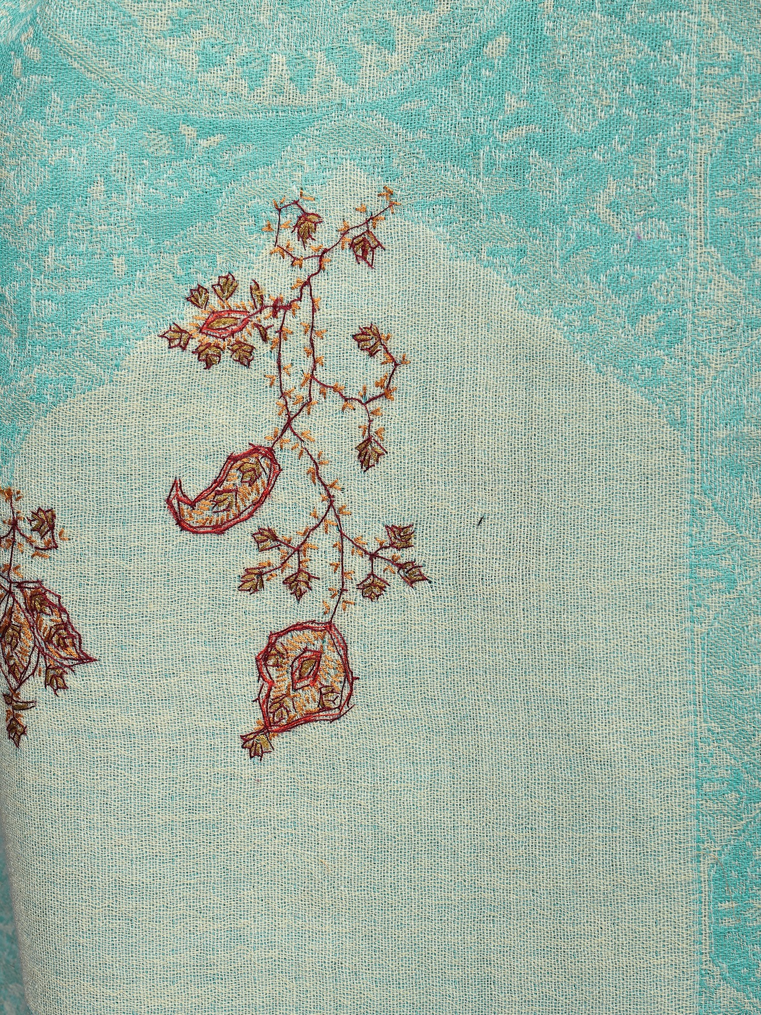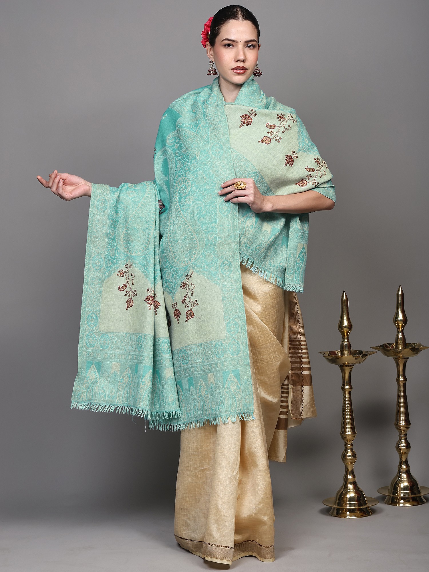 The shawl is adorned with a captivating all-over pattern that draws the eye with its harmonious blend of botanical elements and the iconic paisley design. Delicate floral sprigs, rendered in rich earthy tones, are interspersed with the graceful, tear-drop shapes of paisleys, creating a visual dance across the woolen expanse. The borders are particularly noteworthy, featuring a more structured band of geometric patterns that frame the flowing motifs, adding depth and definition. The interplay of the subtly contrasting light and darker shades of turquoise, combined with the intricate embroidery, creates a rich tapestry of texture and color, evoking a sense of serene beauty reminiscent of an island paradise.