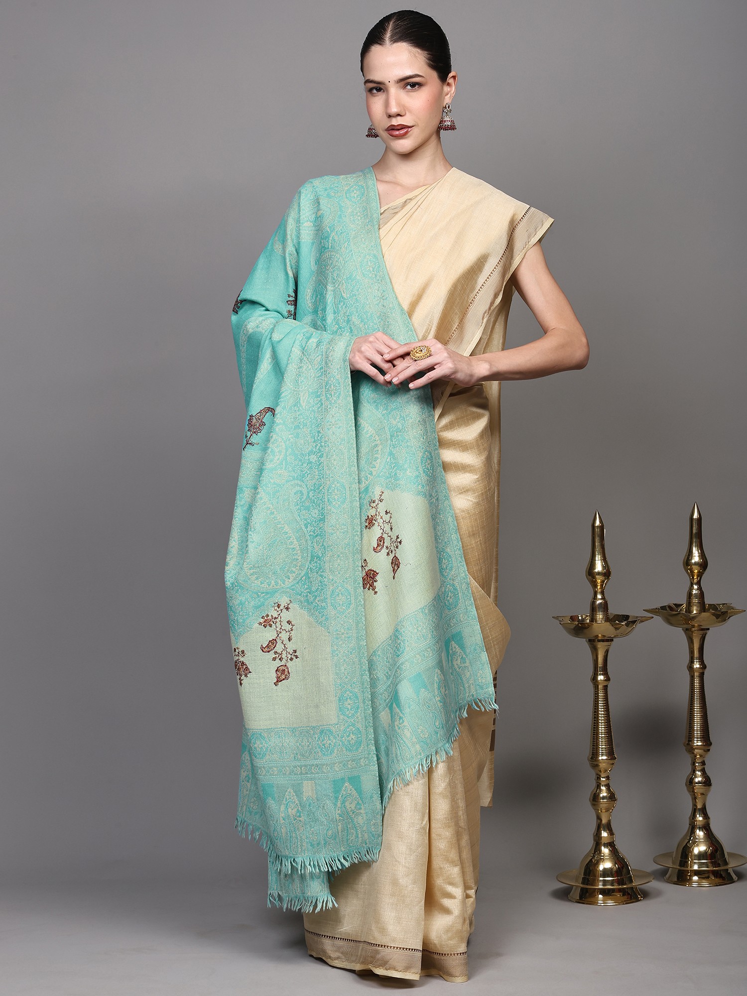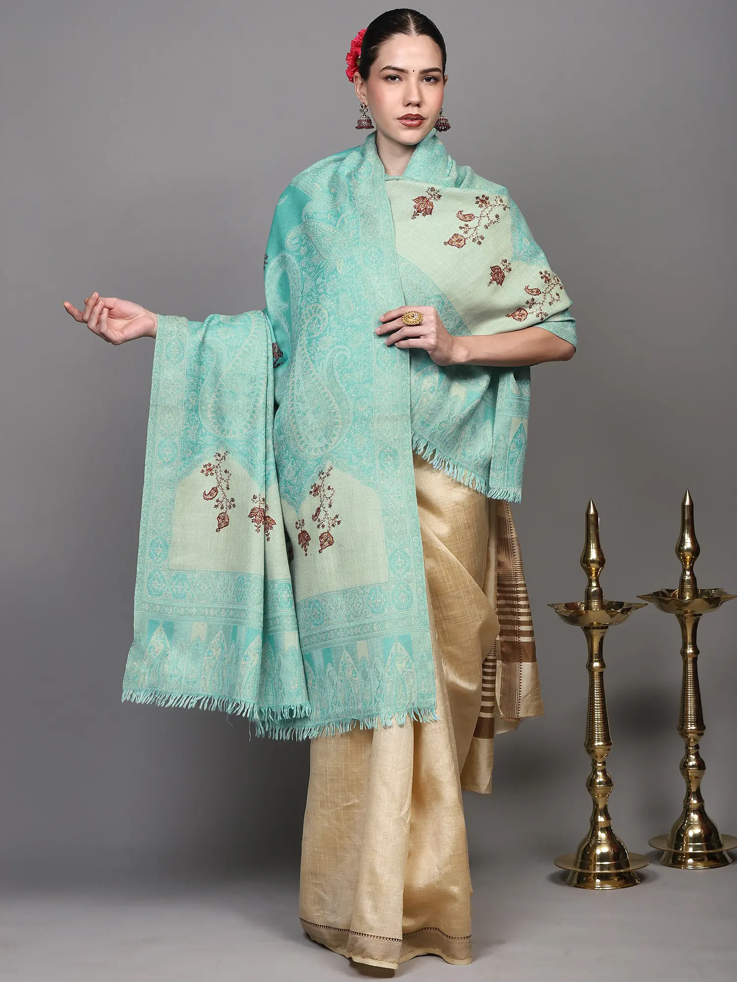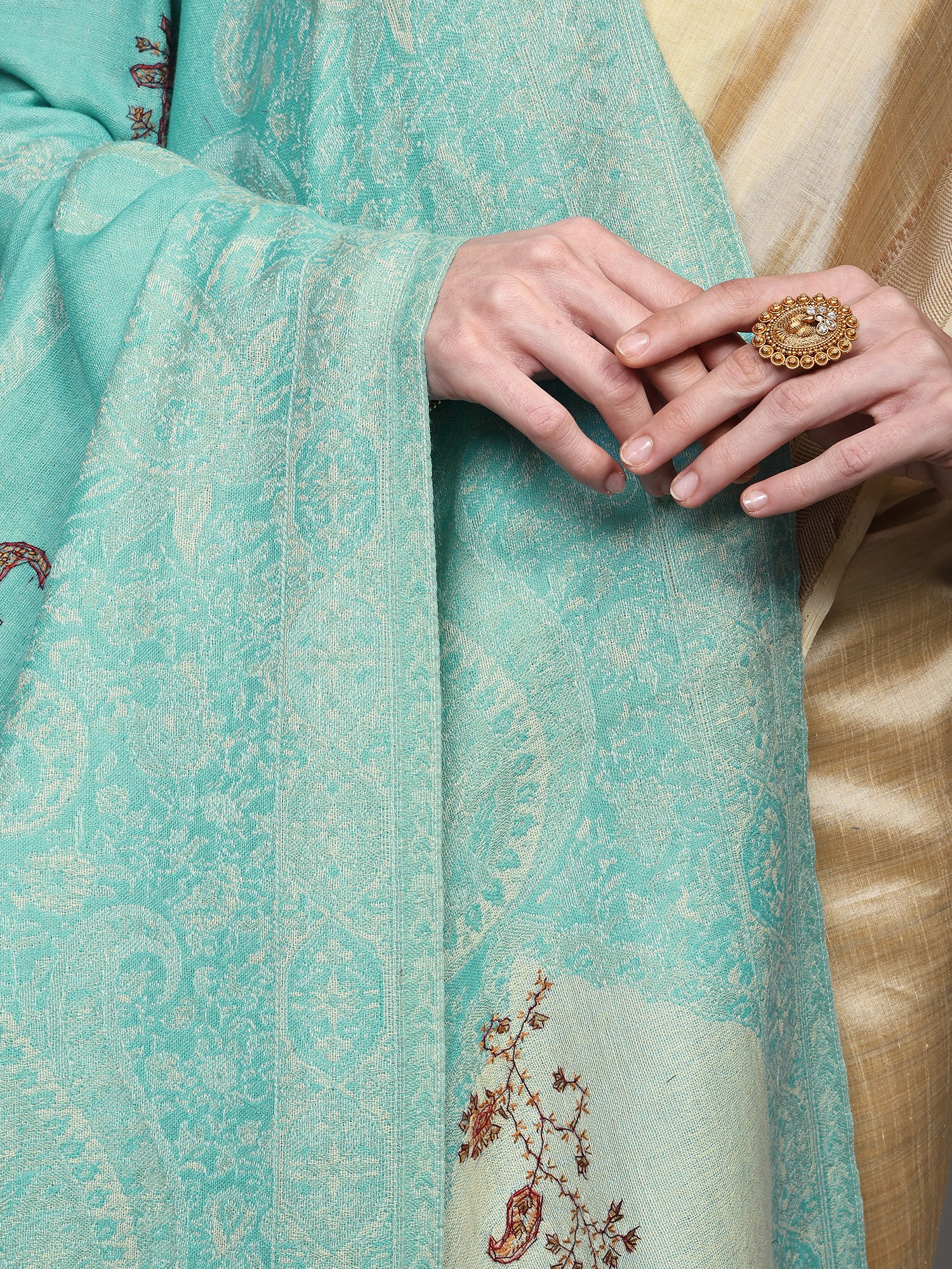 The shawl is adorned with a captivating all-over pattern that draws the eye with its harmonious blend of botanical elements and the iconic paisley design. Delicate floral sprigs, rendered in rich earthy tones, are interspersed with the graceful, tear-drop shapes of paisleys, creating a visual dance across the woolen expanse. The borders are particularly noteworthy, featuring a more structured band of geometric patterns that frame the flowing motifs, adding depth and definition. The interplay of the subtly contrasting light and darker shades of turquoise, combined with the intricate embroidery, creates a rich tapestry of texture and color, evoking a sense of serene beauty reminiscent of an island paradise.