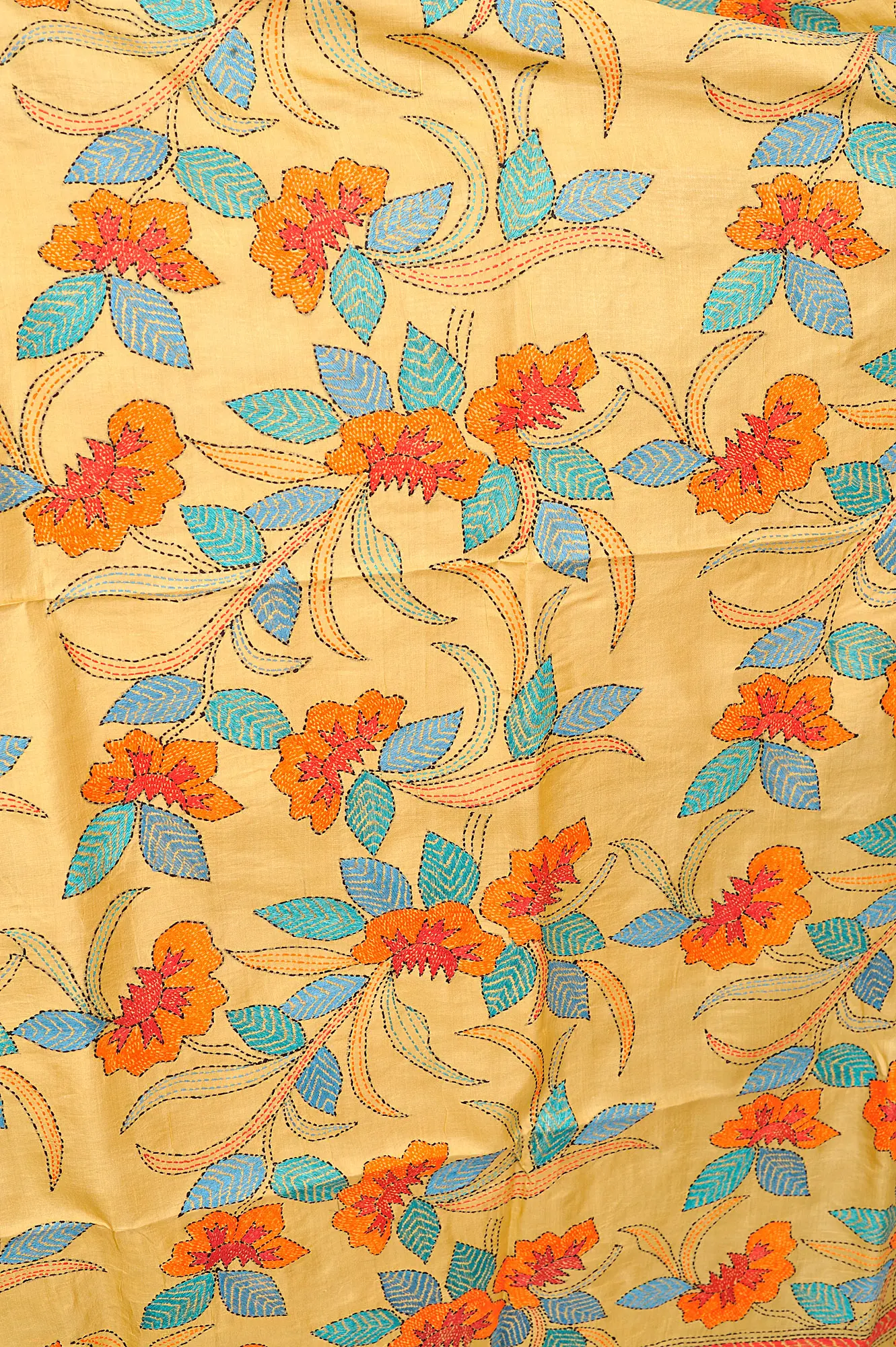 The dupatta is a canvas for a vibrant floral design, brought to life through the traditional Kantha embroidery technique. Each stitch is a testament to the skill and dedication of the artisans who have passed down this art form through generations. The blossoms, rendered in striking shades of orange and accented with delicate turquoise and sky blue leaves, seem to dance across the golden expanse of the silk. The flowing vines and tendrils create a sense of natural movement, making the dupatta a wearable piece of art. The detailed borders, featuring geometric patterns and complementary stitching, frame the floral motif, adding a refined and polished finish.