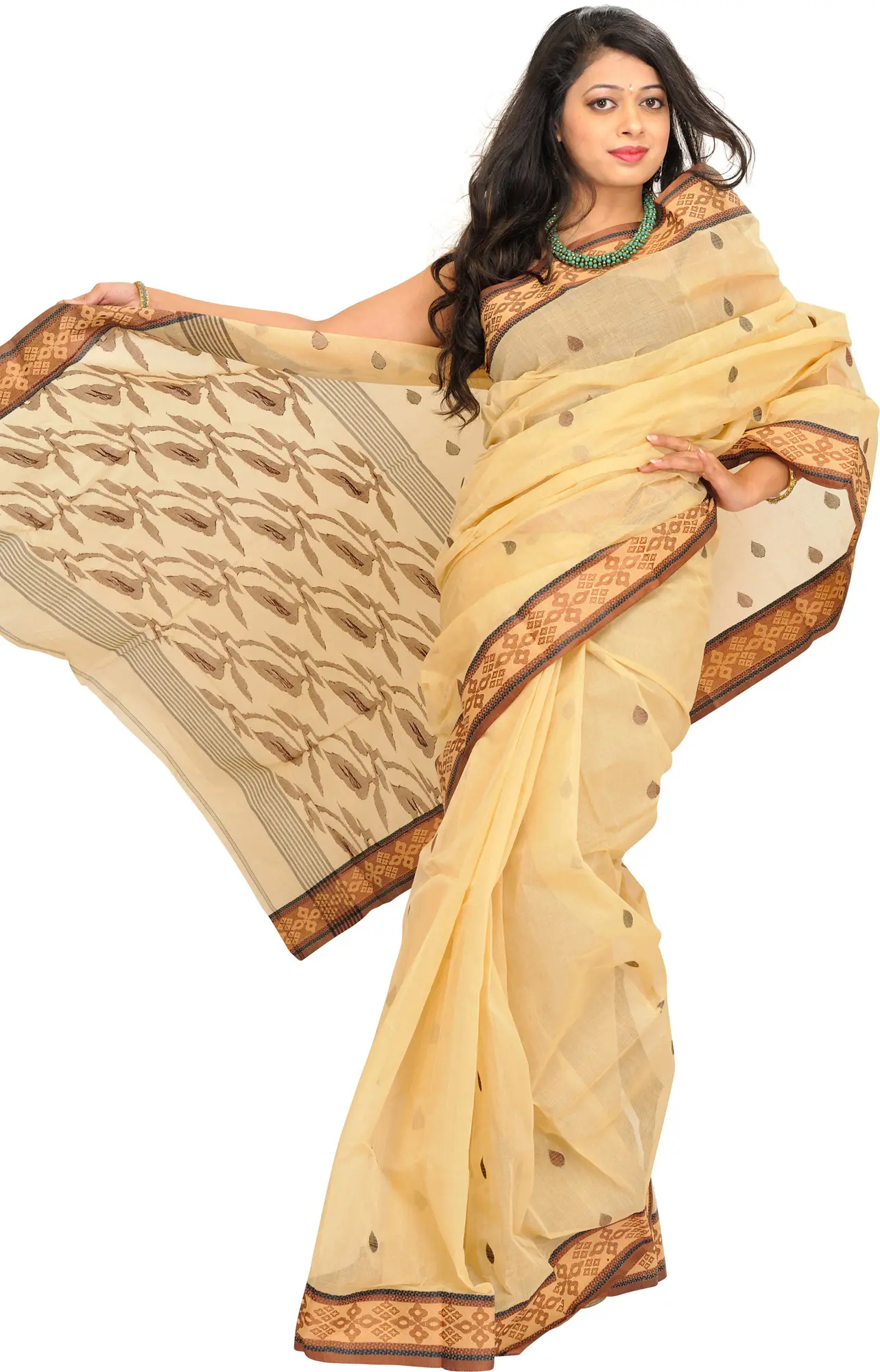The drapes of Bengal are the perfect example of elegance and ease, made with pure cotton and adorned with exotic patterns to give a balance of both. This Italian straw sari from Bengal has a muted color palette, decorated with traditional Butas on the body and a woven border. The endpiece is embellished with an overlay of brown-hued leaves, complementing the minimal elegant tone of the drape to perfection.