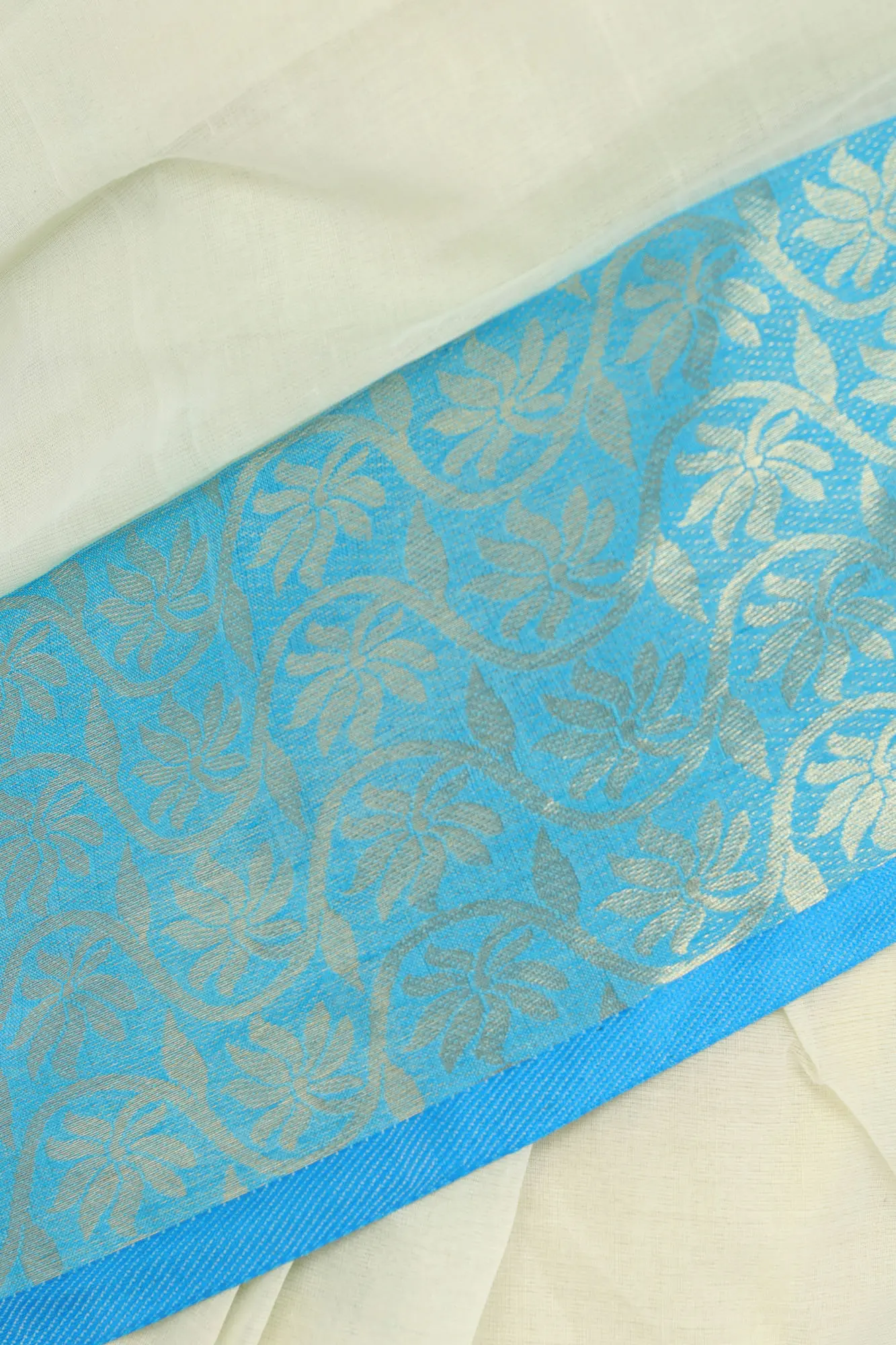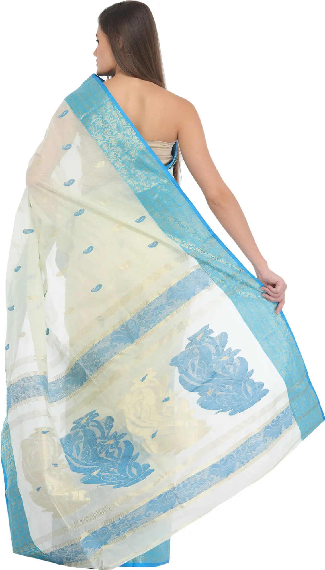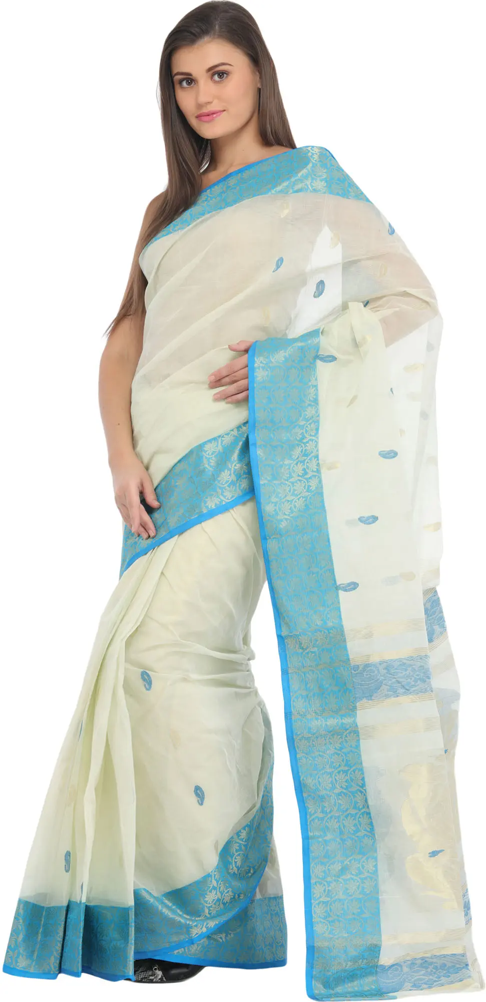 Elegance and comfort wrapped with every thread, this ivory and cyan saree from Bengal speak for the eternal beauty of traditional Indian drapes. The milky white field of the saree is dotted with classic paisley patterns in blue, complementing the lovely blue border which is adorned with floral embellishments in shimmering silver threads, adding a luxuriousness to the otherwise understated appeal of the drape.