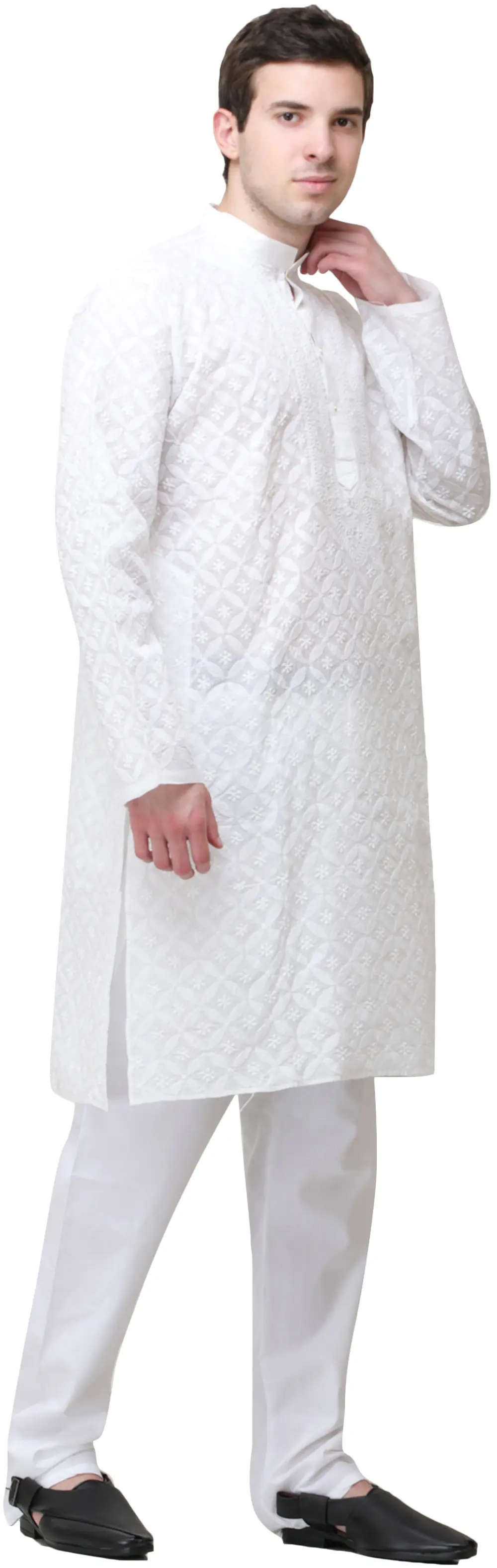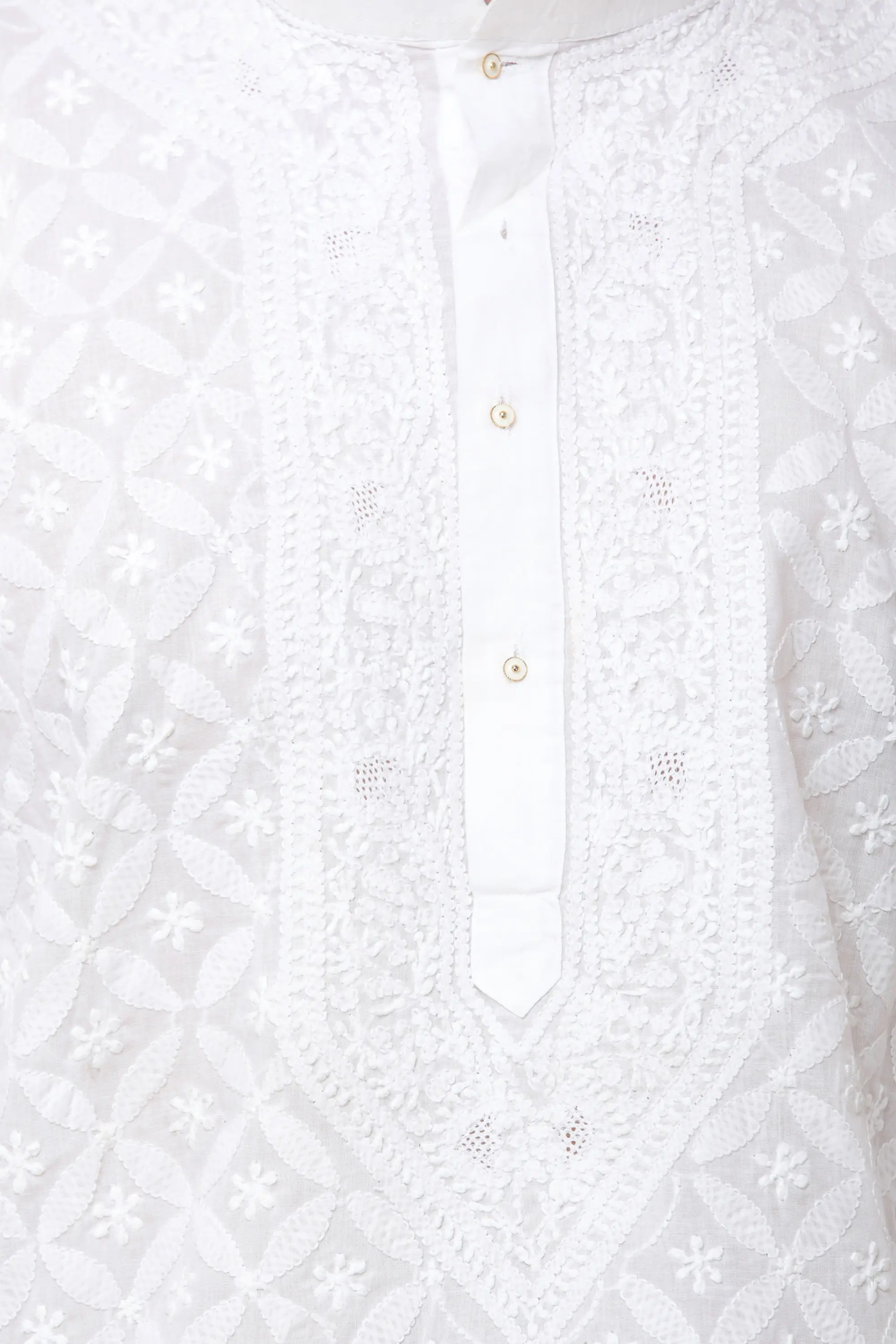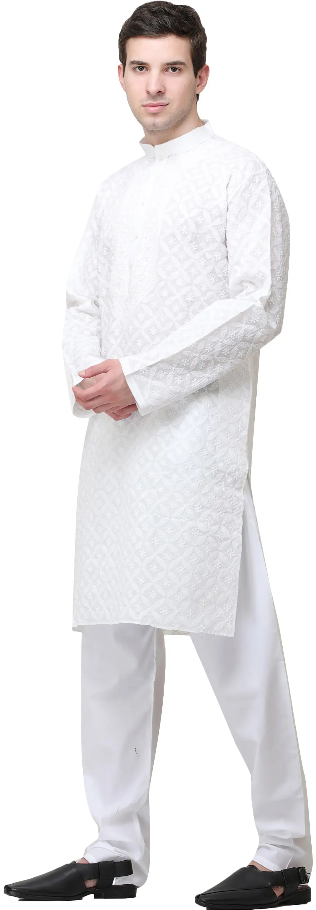 Snow-White Kurta Pajama with Lucknavi Chikan Embroidery All-Over
