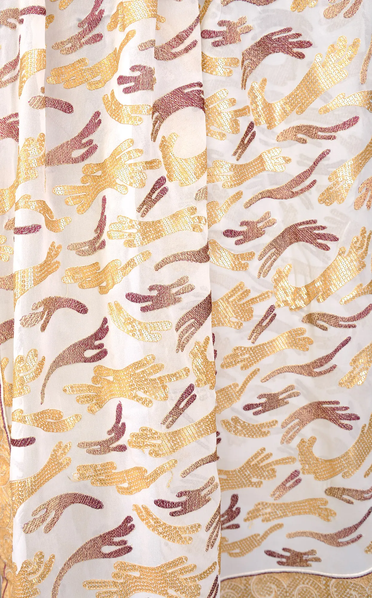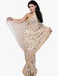 A statement of shimmering elegance, this ivory designer saree is made rich with a touch of metallic threads, which create marvelous patterns all over. The contrasting appeal of golden sequins and copper threads on the field of the saree infuse it with a shimmering appeal, which is complemented by the intricately adorned border.