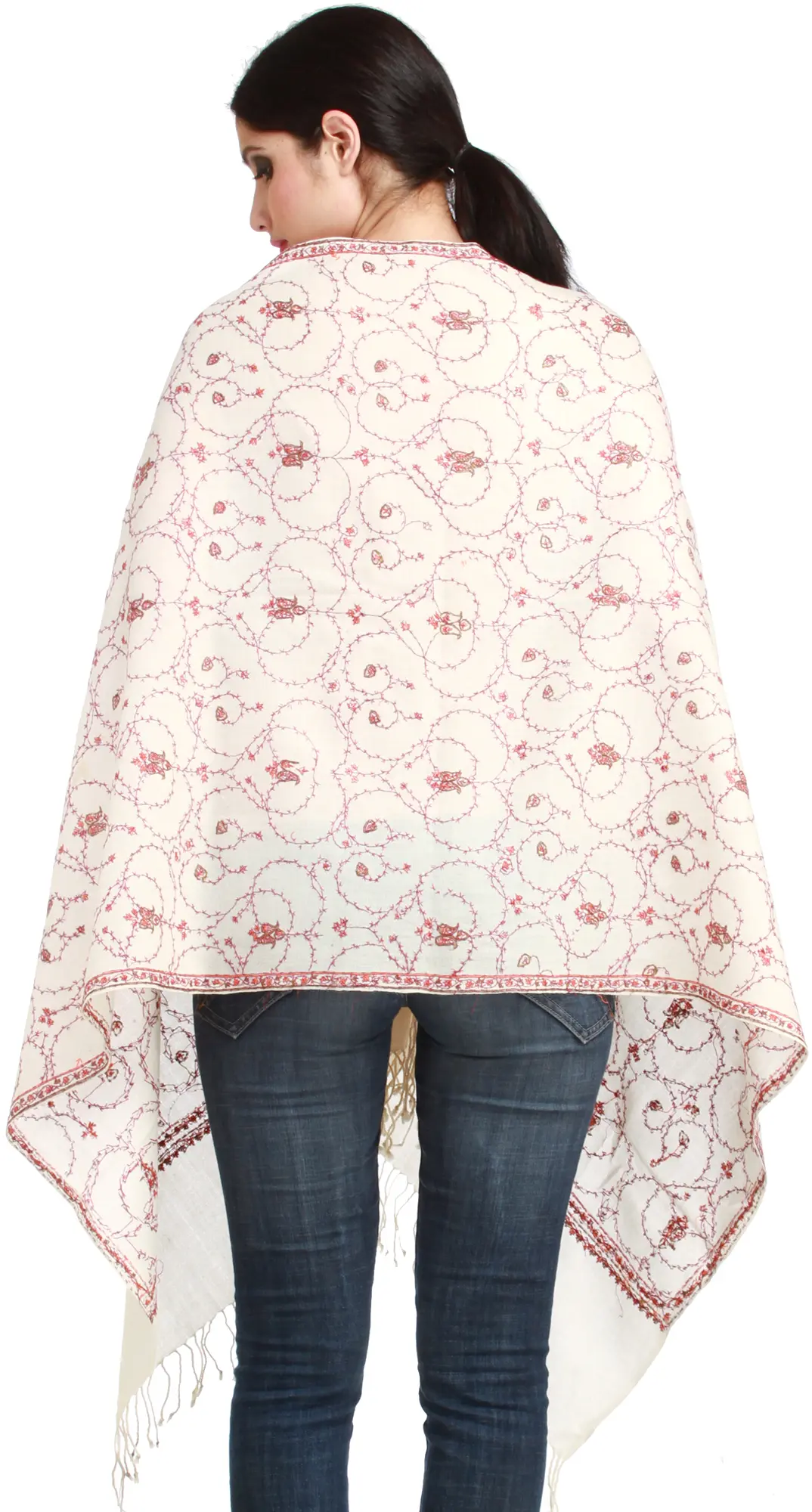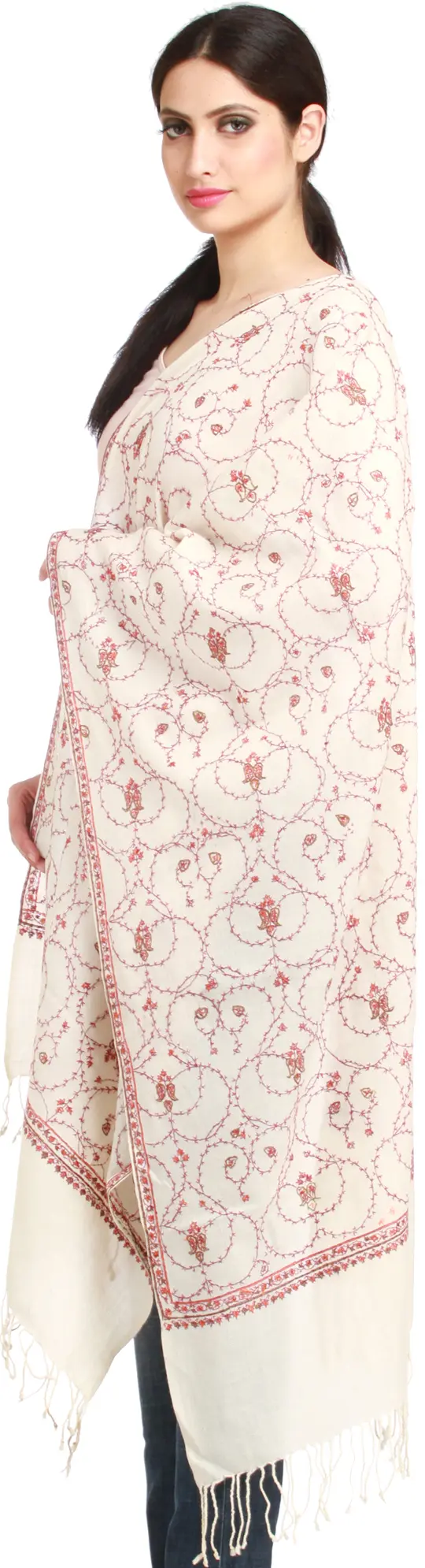 Tusha Stole from Kashmir with Sozni Hand-Embroidered Floral Vines and Paisleys