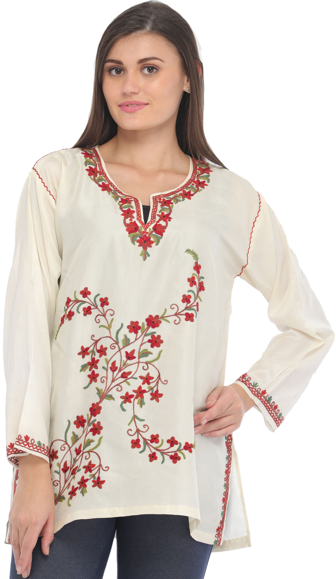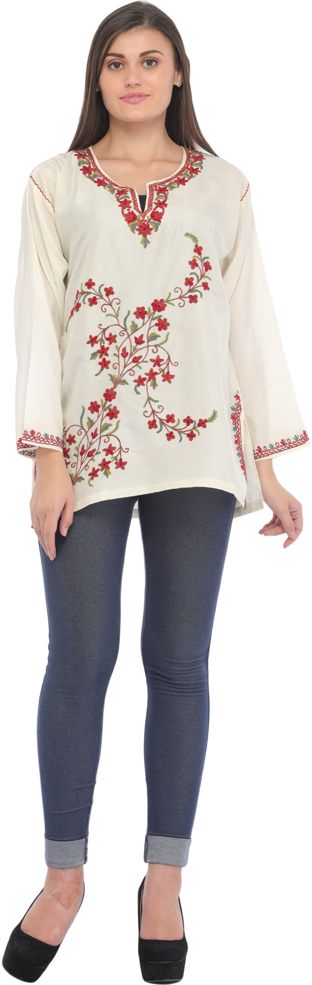 Pure Silk Short Kurti from Kashmir with Aari Embroidery by Hand