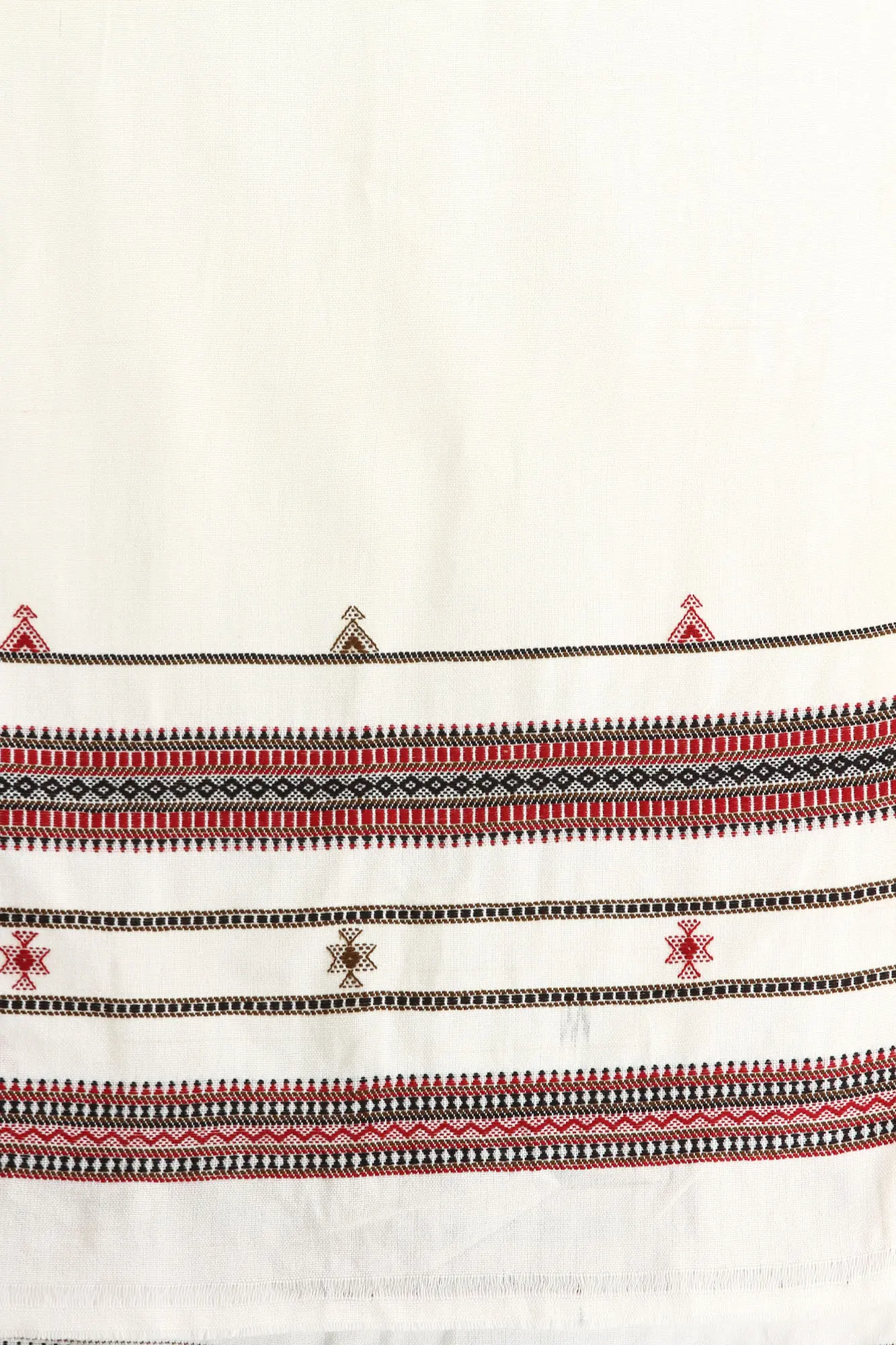The true beauty of this shawl lies in its captivating border, adorned with a meticulously crafted thread weave. This intricate detailing adds a layer of sophistication and visual interest, transforming a simple shawl into a piece of wearable art. The borders feature a harmonious blend of rich reds, deep blacks, and subtle greys, woven in a striking striped pattern. Further enhancing the visual appeal, delicate geometric motifs and tiny, stylized figures are intricately embroidered along the edges, showcasing the signature Kutch embroidery style. These fine details speak volumes about the artisan's precision and the enduring legacy of their craft.