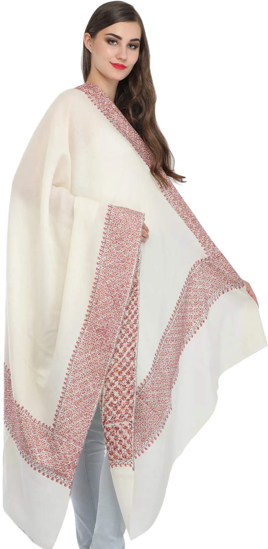 Ivory Diamond Weave Pure Pashmina Shawl with All-Over Sozni Hand-Embroidered Foliage Jaal from Kashmir