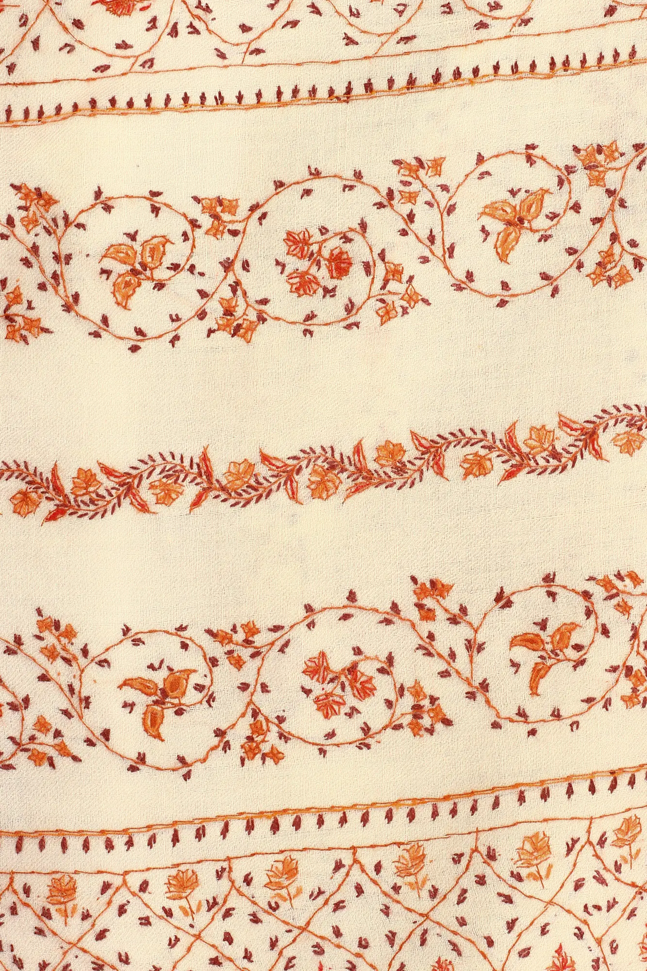 The true allure of this stole lies in its breathtaking Sozni hand-embroidery. This traditional Kashmiri art form is renowned for its delicate and intricate needlework, and this piece showcases it beautifully. Tiny, precise stitches are used to create a mesmerizing pattern of floral motifs and geometric borders in warm, earthy tones. The artistry involved in applying each stitch by hand is a labor of love, passed down through generations of skilled artisans. The detailed vine-like patterns with delicate blossoms and leaves are meticulously stitched, creating a rich tapestry of design across the soft ivory wool. The careful placement of each motif, from the wider bands of scrolling vines to the narrower, more abstract lines, demonstrates a deep understanding of aesthetic balance and visual harmony.