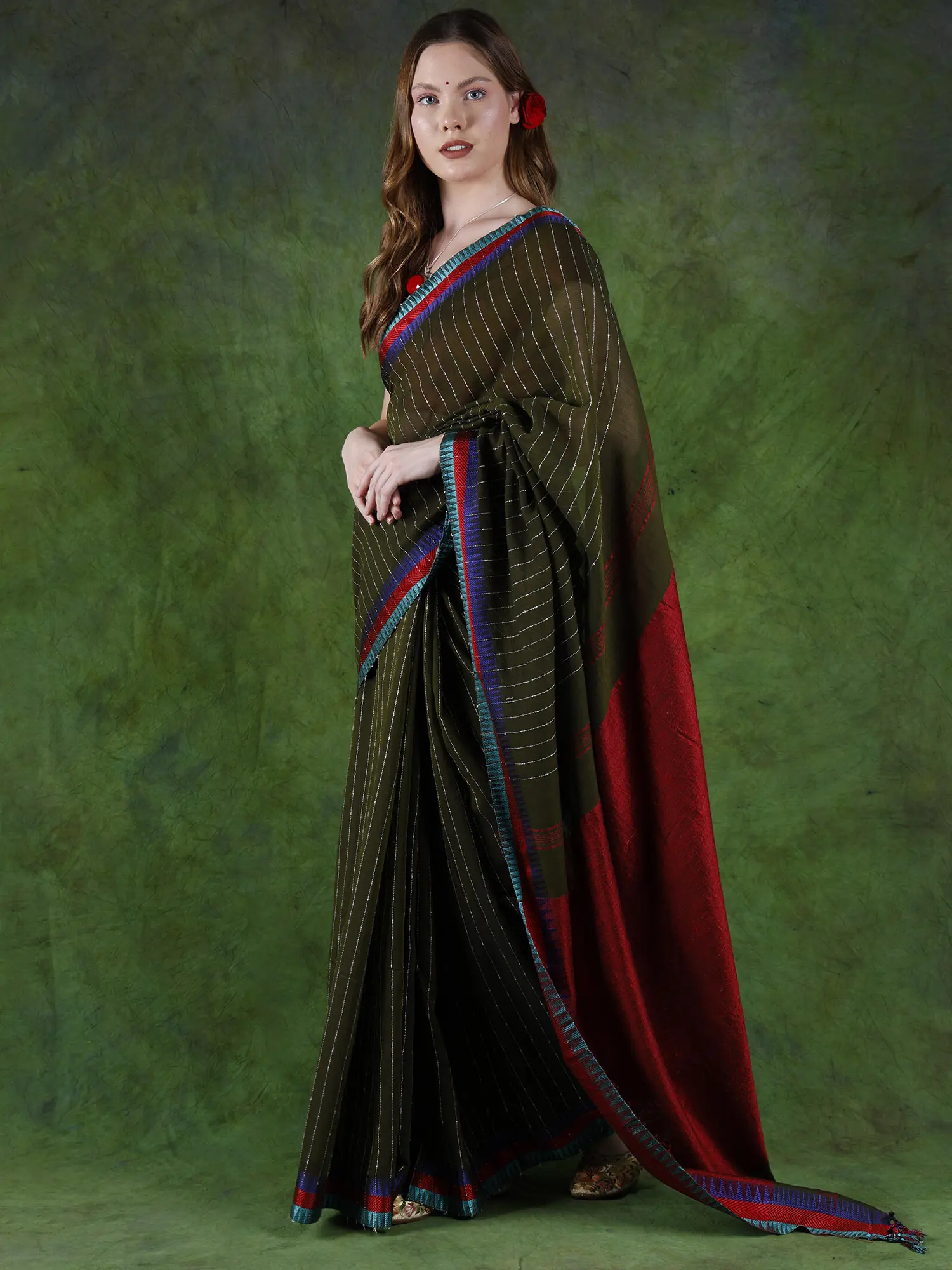 Carry a classic charm to every occasion you grace with this beautiful Ivy-Green pure cotton saree. The mystique in the color palette of the saree makes up for the minimal embellishment, offering comfortable and stylish ethnic wear.