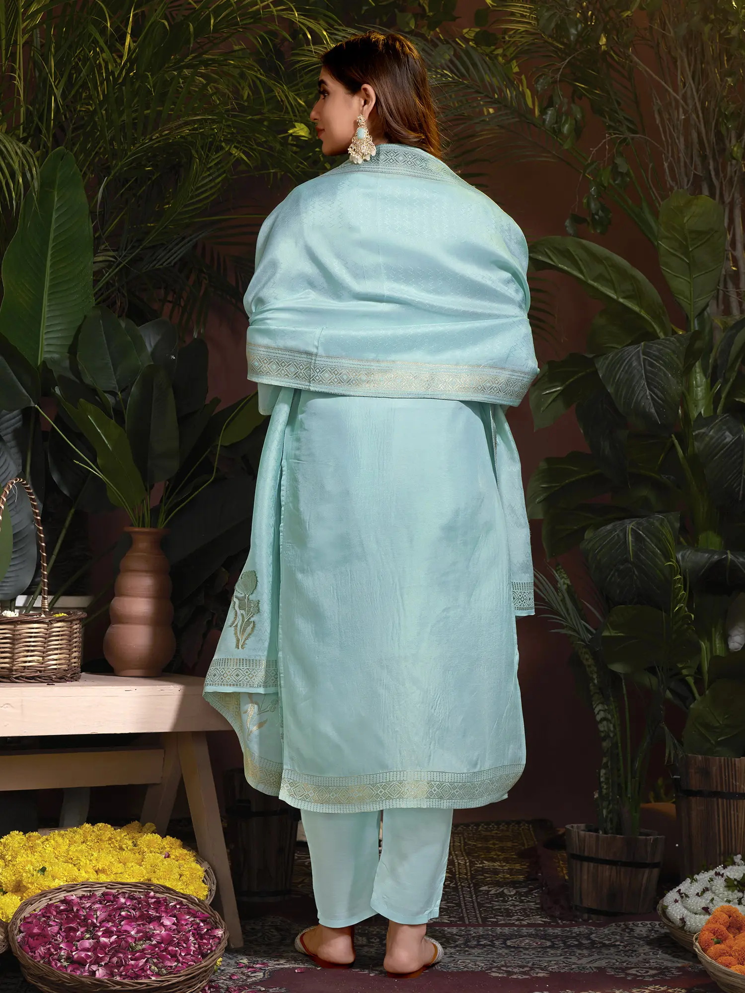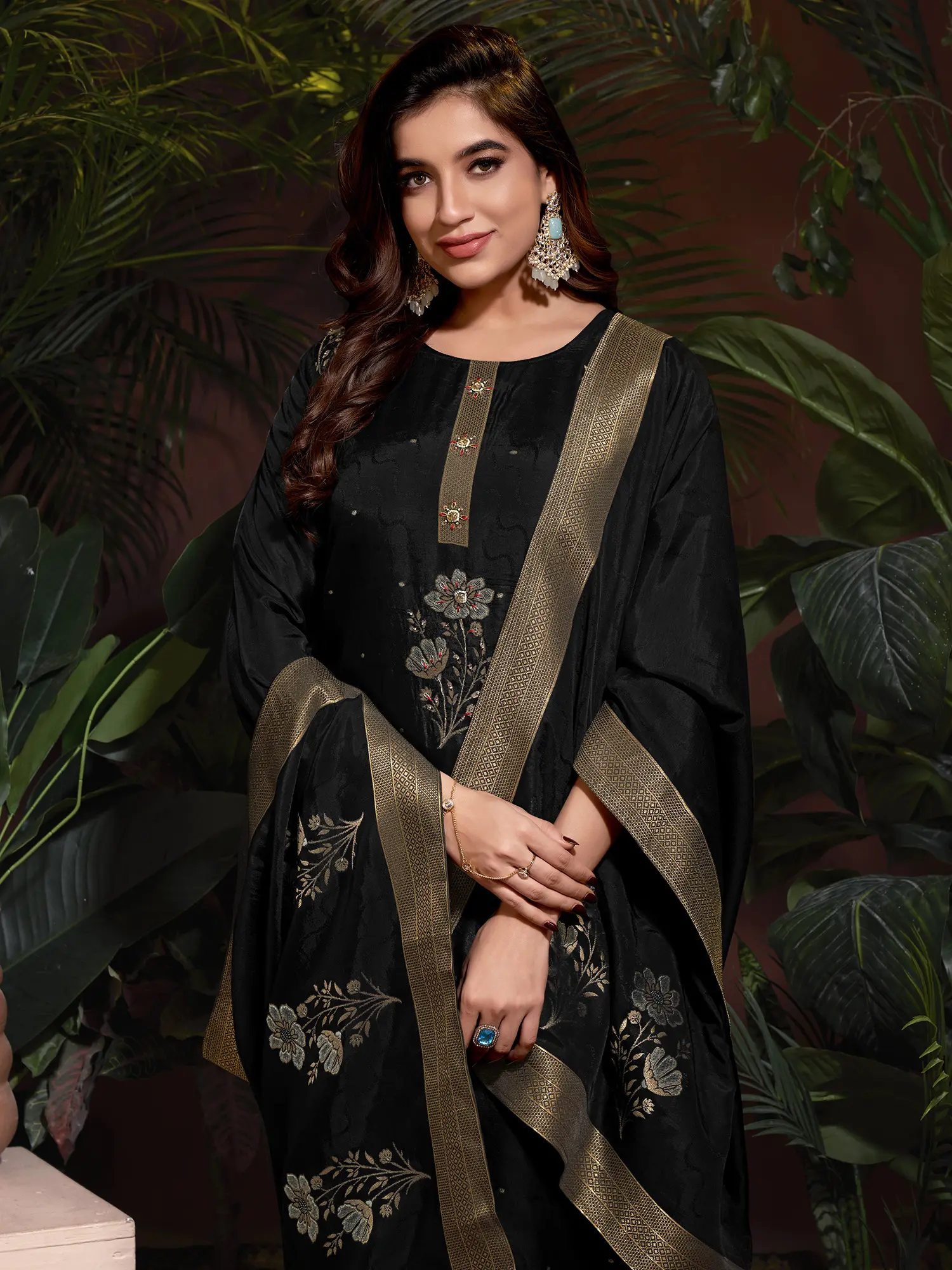 Made with natural viscose, the salwar and kurta have a soft and shimmering look, enhanced by tiny butis and golden details on the border.