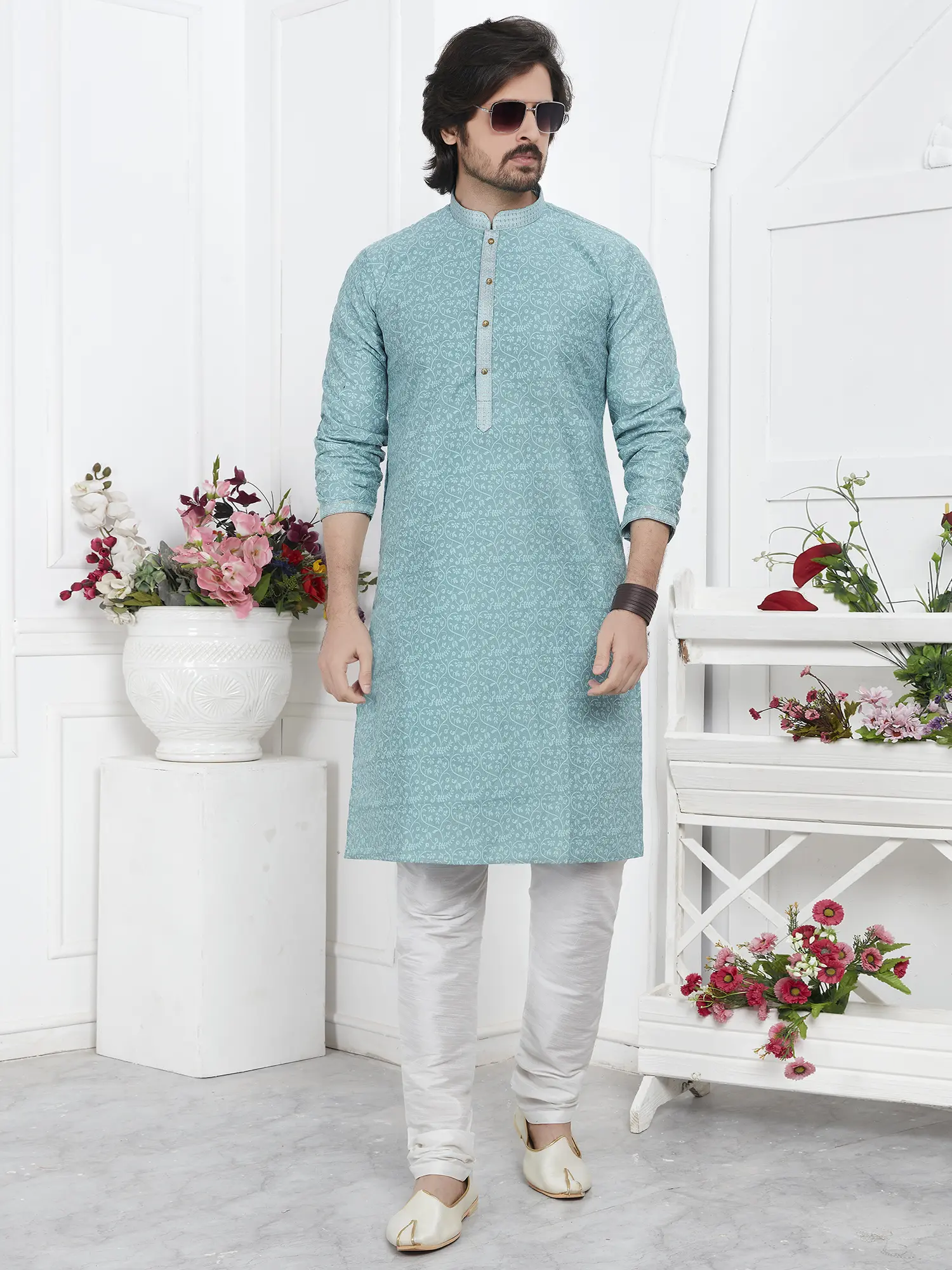 Sky-Blue Cotton Floral Printed Waistcoat With Dupion Silk Kurta Pajama