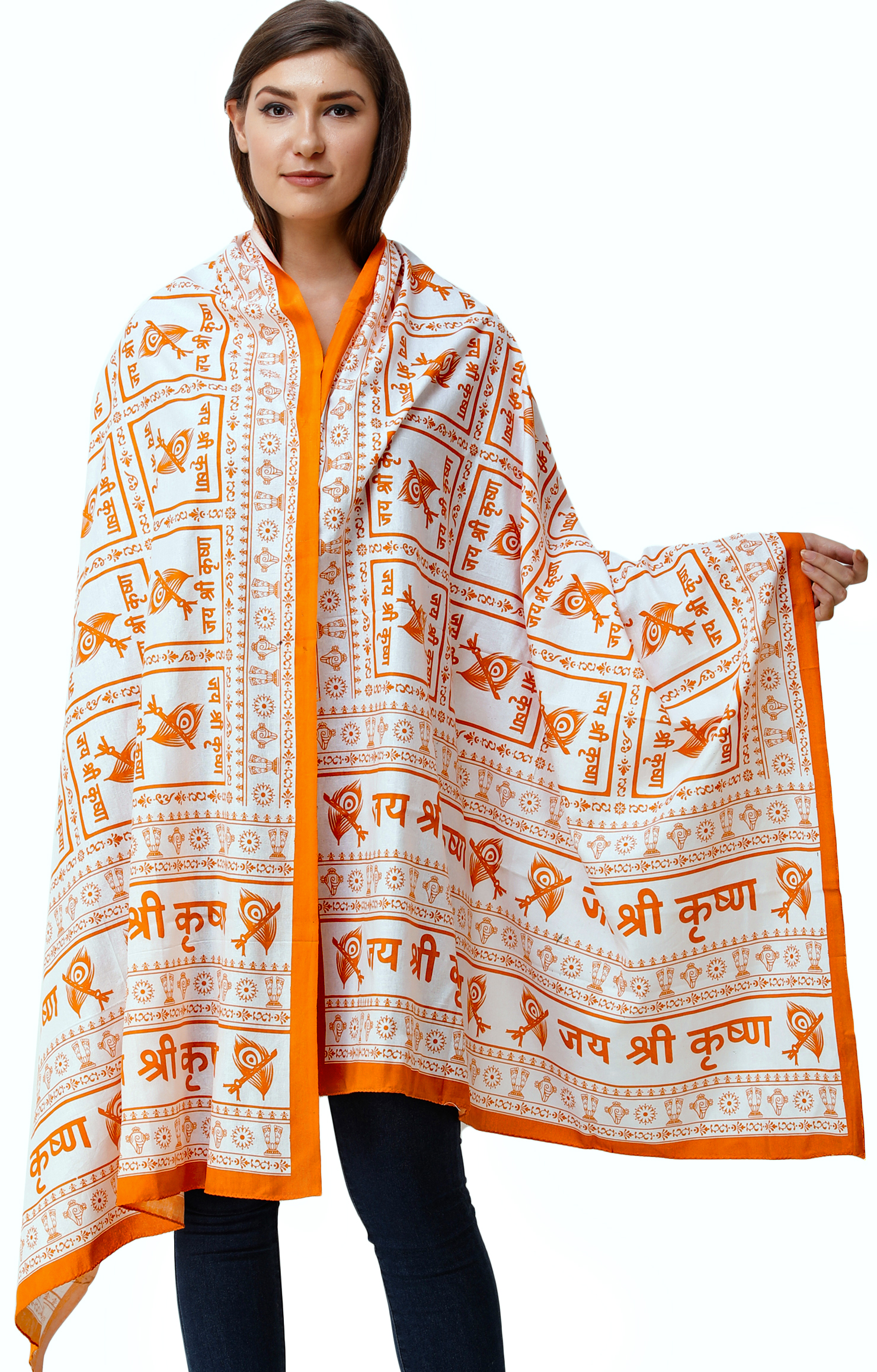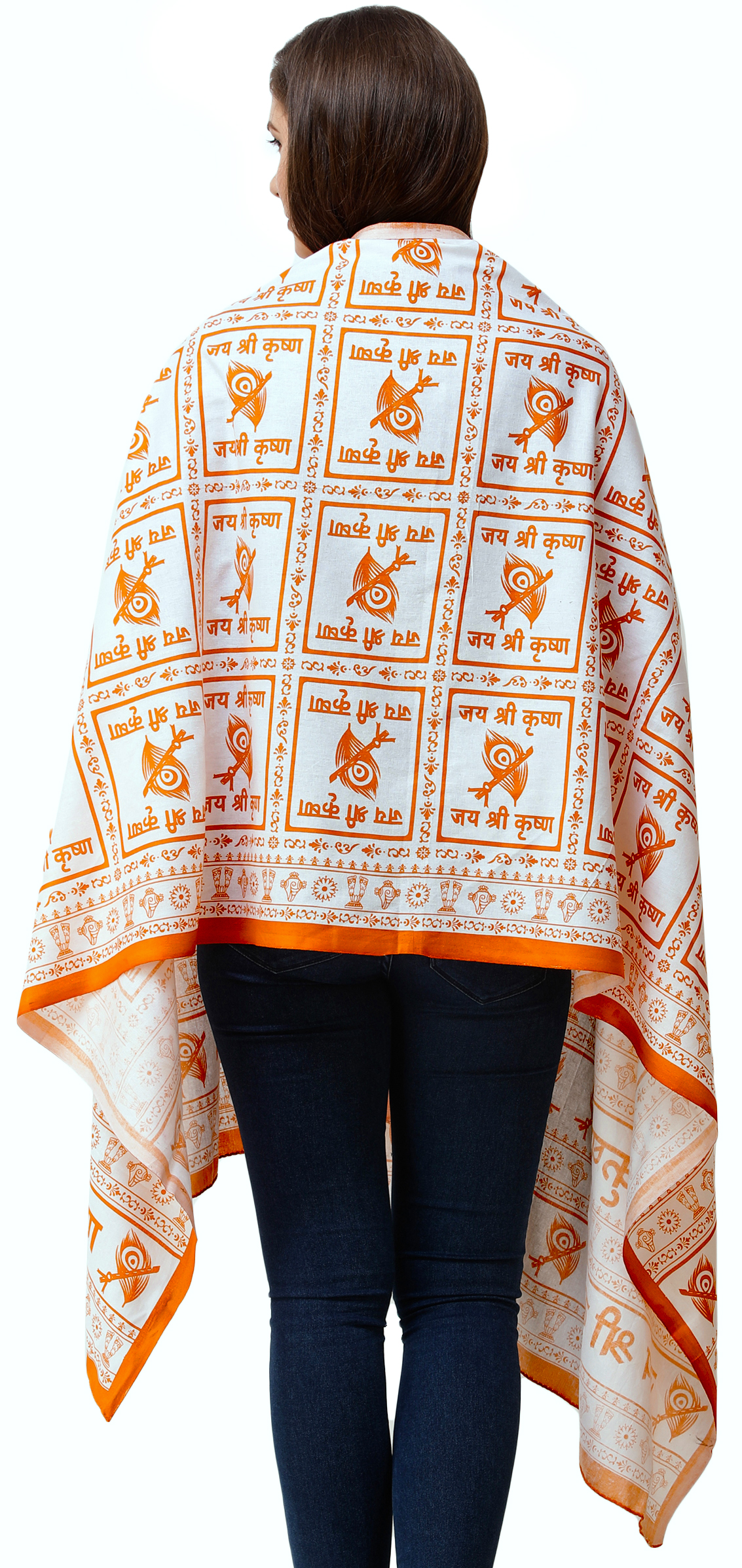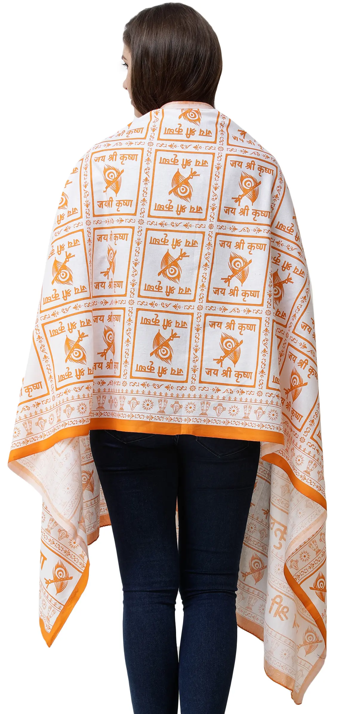 Beyond its role in prayer and meditation, this shawl is a versatile piece that can be worn in various ways. Drape it over your shoulders for a touch of spiritual elegance during daily activities, or use it as a sacred covering during religious ceremonies. Its striking design also makes it a unique fashion statement, allowing you to carry a piece of divine artistry with you wherever you go. The bright orange print on a crisp white background is both visually appealing and spiritually uplifting, creating an aura of peace and devotion. This prayer shawl makes a thoughtful gift for loved ones who hold a deep reverence for Lord Krishna, offering them a tangible connection to their faith.