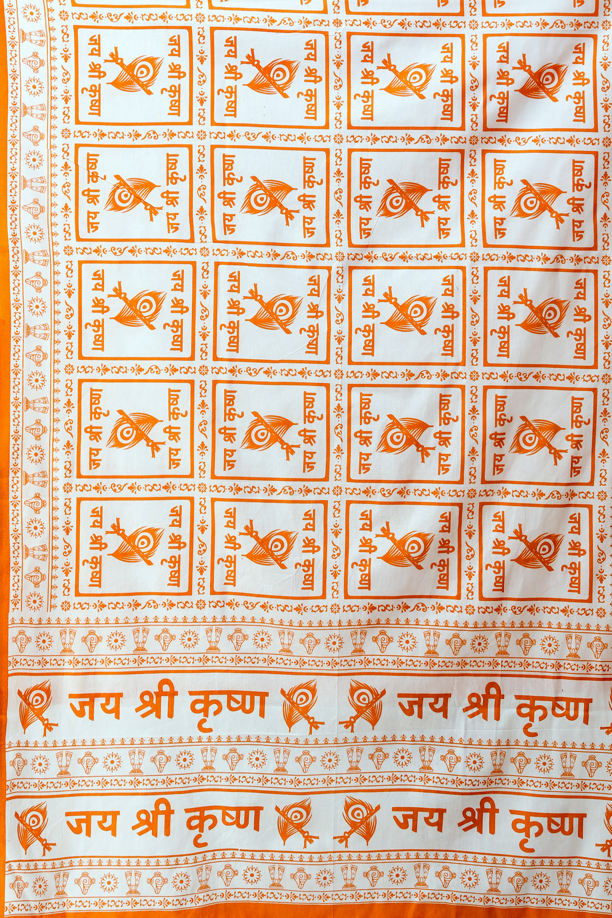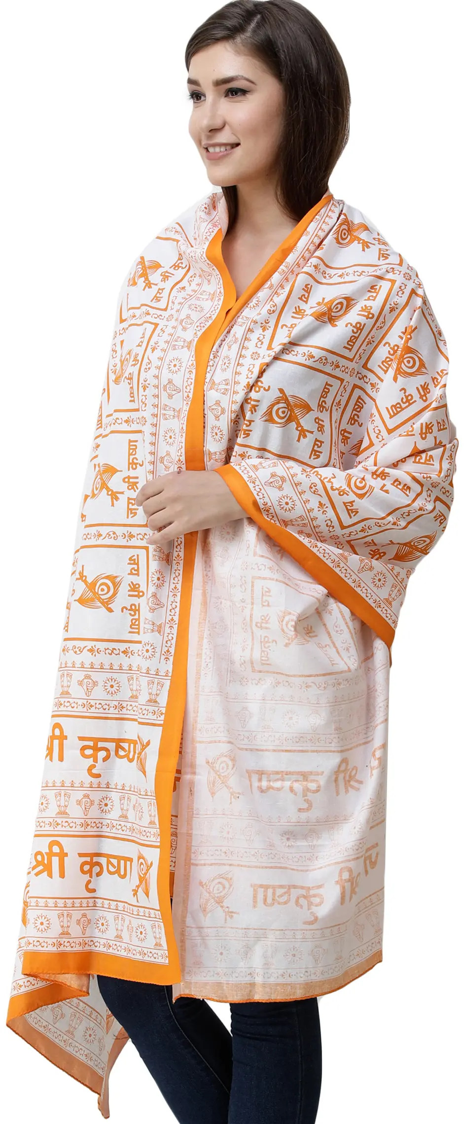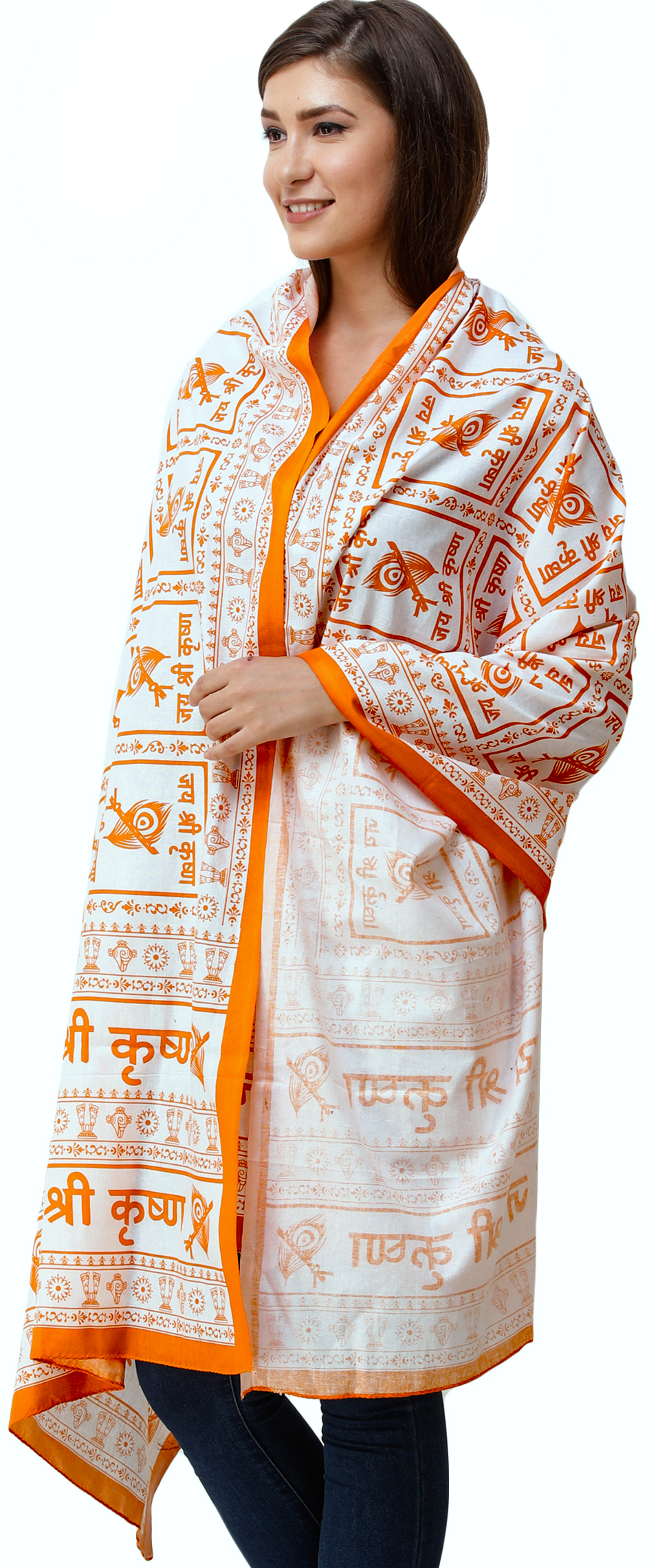 Beyond its role in prayer and meditation, this shawl is a versatile piece that can be worn in various ways. Drape it over your shoulders for a touch of spiritual elegance during daily activities, or use it as a sacred covering during religious ceremonies. Its striking design also makes it a unique fashion statement, allowing you to carry a piece of divine artistry with you wherever you go. The bright orange print on a crisp white background is both visually appealing and spiritually uplifting, creating an aura of peace and devotion. This prayer shawl makes a thoughtful gift for loved ones who hold a deep reverence for Lord Krishna, offering them a tangible connection to their faith.