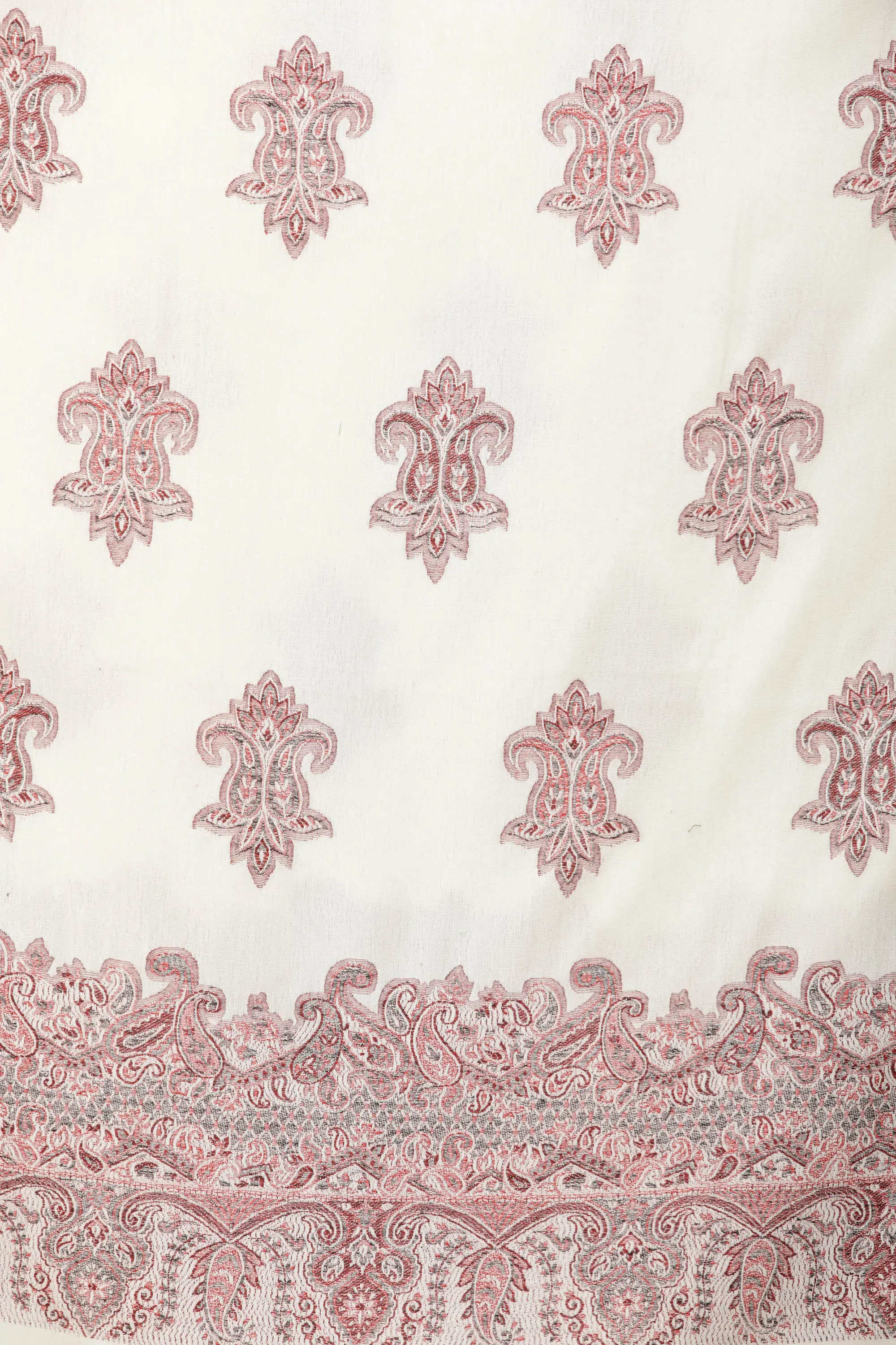 The allure of Jamawar craftsmanship shines brightly with our Woven Border and Paisleys Shawl. The fabric, rich in history, comes to life with intricate paisley patterns and a meticulously woven border. The origins of Jamawar can be traced back to Persian royalty, and its timeless appeal still resonates today. The earthy color palette adds a touch of sophistication to modern trends, making it a prized possession that blends tradition and contemporary style seamlessly. Skilled artisans ensure that every detail is perfect, reflecting the precision and dedication in each thread.