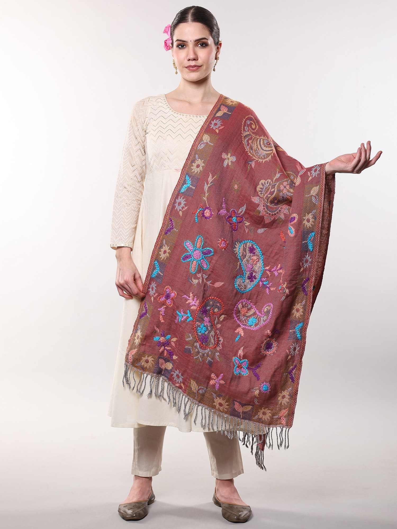 The gentle, tender, and gorgeous base of fine wool is brought to life by the multi-colored embroidered floral and paisley patterns, which are spread through the entire masterpiece. Made with love and passion in Amritsar, embraces the traditions and cultures of the nation into this fine piece of clothing. Like the layered cultures and religions found in this country, the stole showcases the beauty of multi-colors, each bringing in its own significance and attractiveness.
