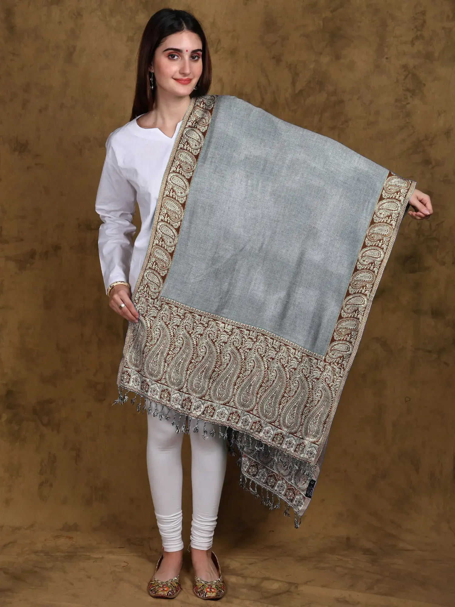 Elevate your wardrobe with this exquisite Jamawar stole, a true testament to artisanal craftsmanship. Hailing from the renowned weaving hub of Ludhiana, this stole is a symphony of traditional design and contemporary appeal. The core of the stole is a serene, solid expanse, offering a versatile canvas that complements any outfit. This clean aesthetic is beautifully contrasted by the meticulously detailed borders, which showcase the iconic paisley motif in a striking green and white pattern.