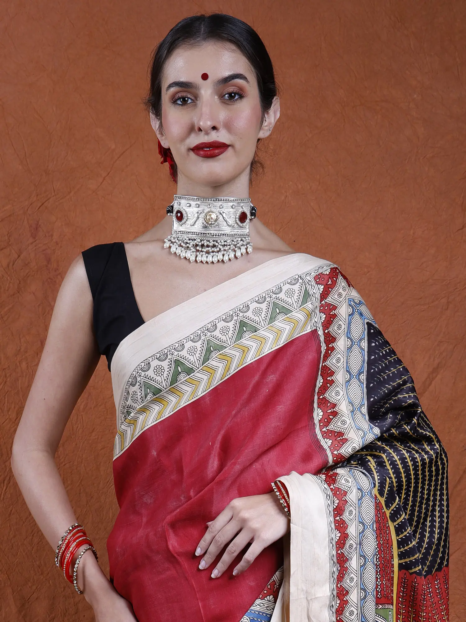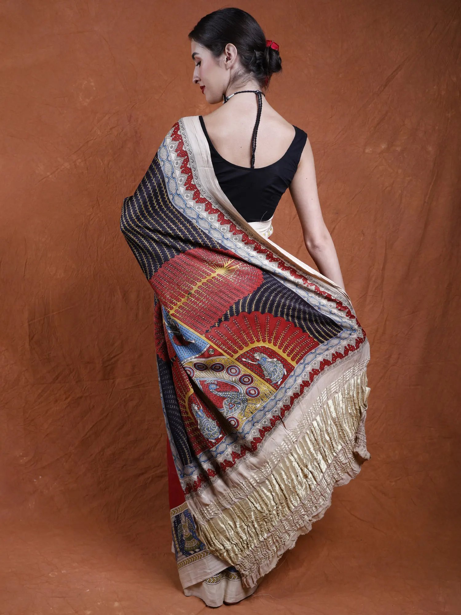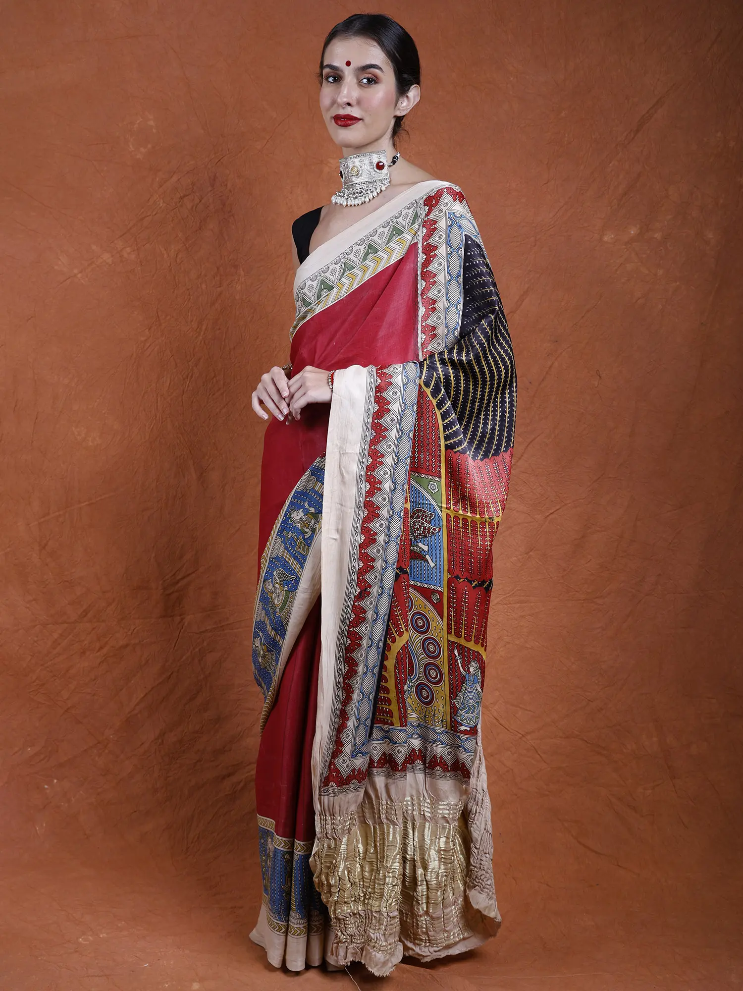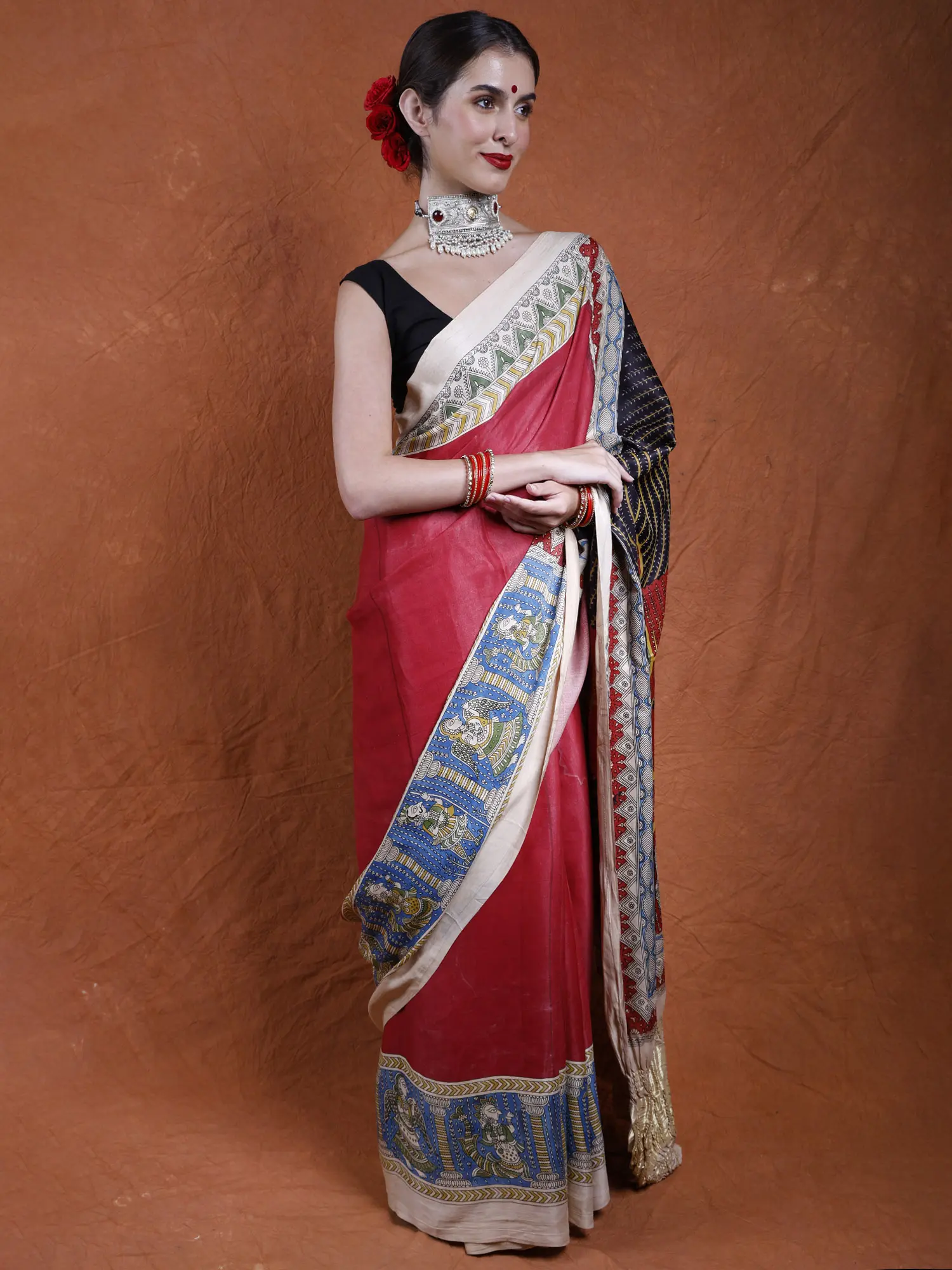 This Jester-Red Mata Ni Pachedi Folk Saree from Gujarat is a true embodiment of uniqueness and tradition. Adorned with a hand-painted peacock motif, it showcases the intricate artistry of Gujarat's Mata Ni Pachedi folk tradition. The vibrant jester-red hue adds a bold and striking touch, while the peacock symbolizes beauty, grace, and spirituality.