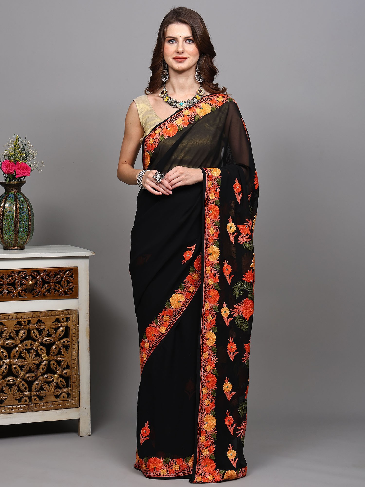 The saree is brought to life by delicate floral vines, embroidered with precision and flair. Each bloom and leaf is rendered in a symphony of warm hues – fiery oranges, sunny yellows, and pops of crimson, intertwined with verdant greens. This meticulous Aari embroidery, a traditional needlework technique from Kashmir, creates a textured, three-dimensional effect that truly captivates the eye. The patterns flow gracefully along the length of the saree, drawing attention to its graceful drape and enhancing the natural beauty of the wearer. The contrast between the dark georgette and the bright, celebratory embroidery creates a look that is both sophisticated and boldly expressive.