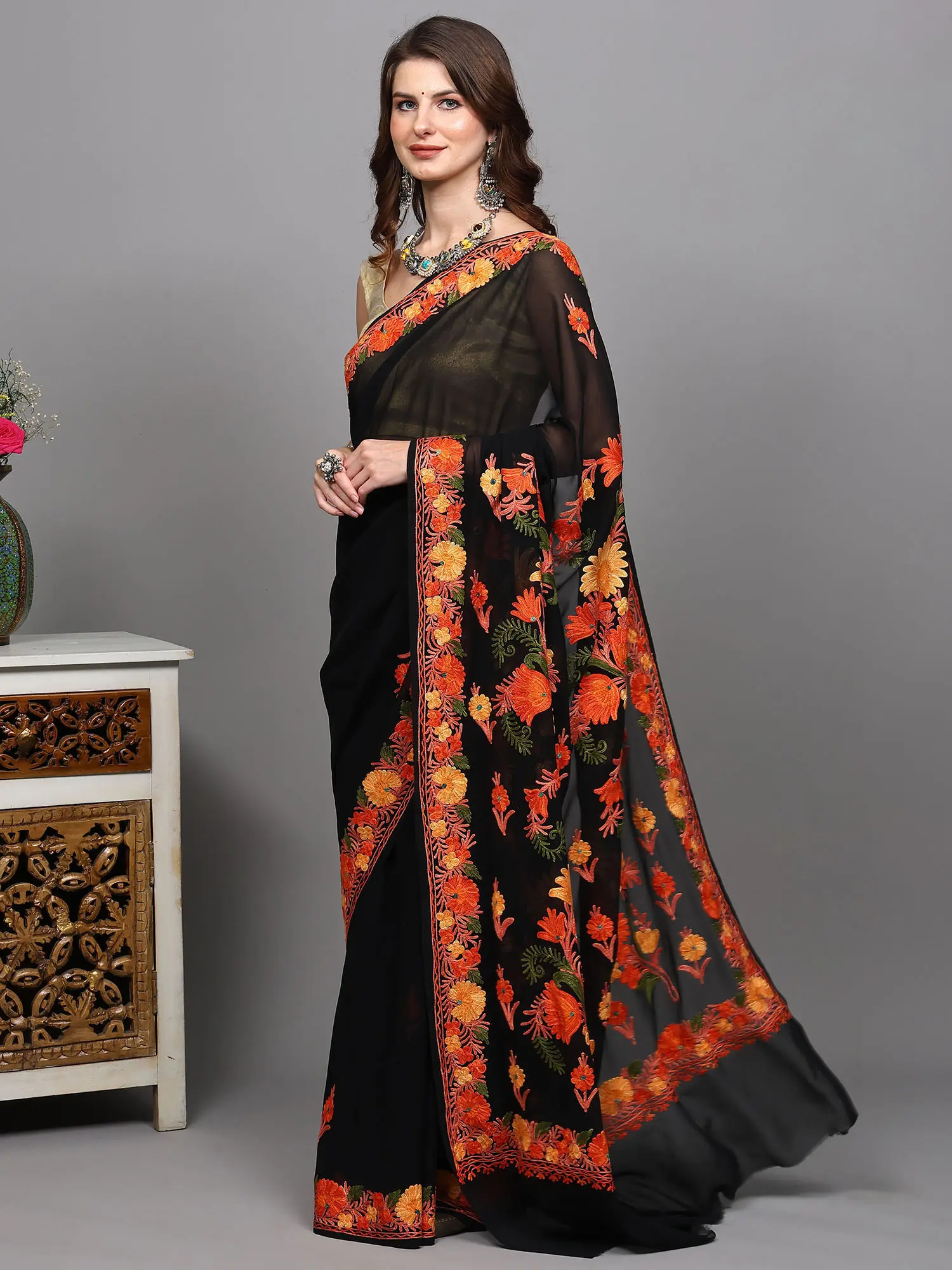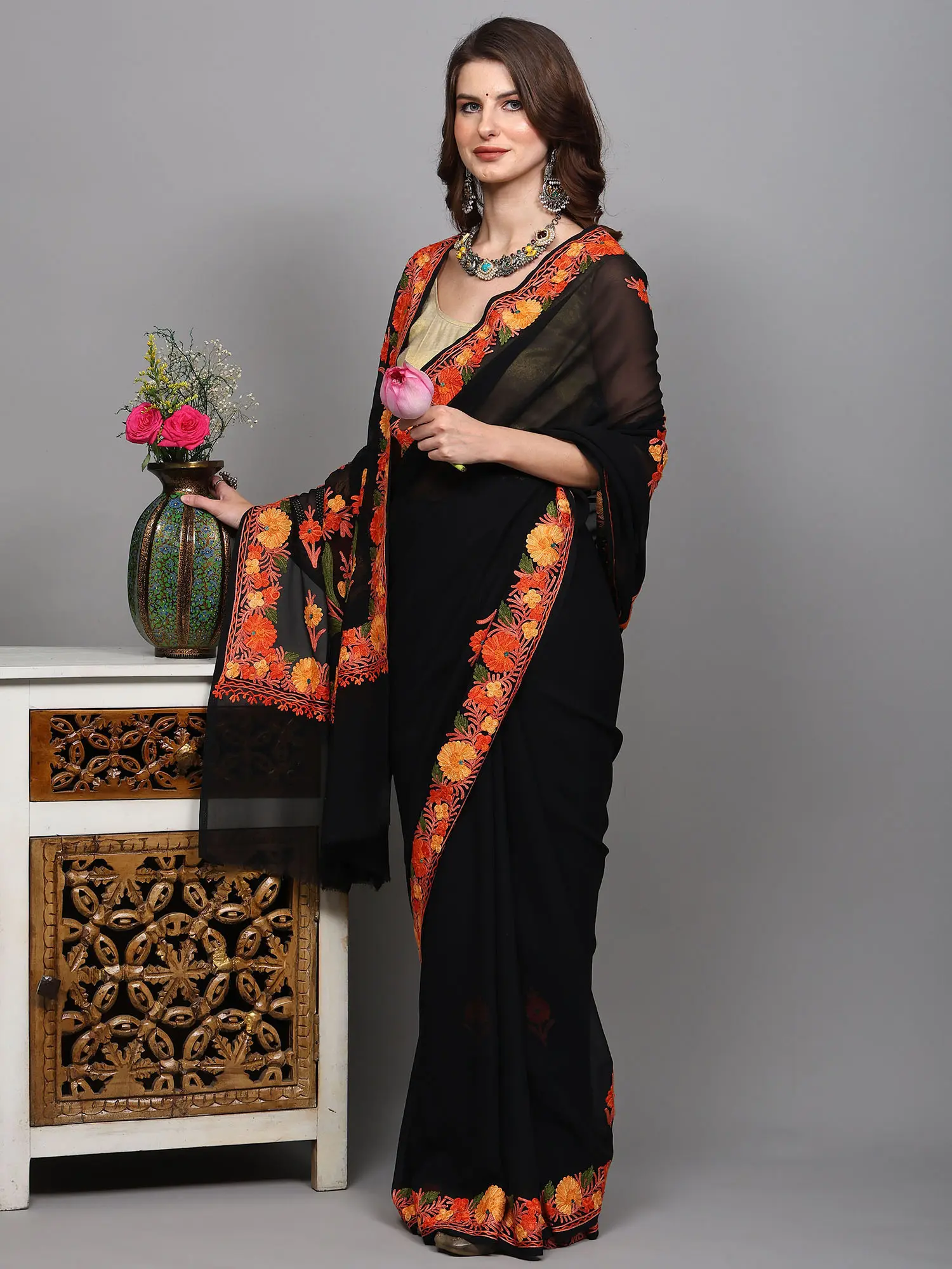 Immerse yourself in the timeless elegance of this exquisite georgette saree, a testament to the rich heritage of Kashmiri artistry. The deep, jet-black canvas of the georgette fabric provides a dramatic backdrop for the vibrant and intricate Aari embroidery that adorns its borders and motifs. This is more than just a garment; it's a wearable piece of art, meticulously crafted by skilled artisans who have honed their craft over generations.