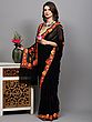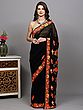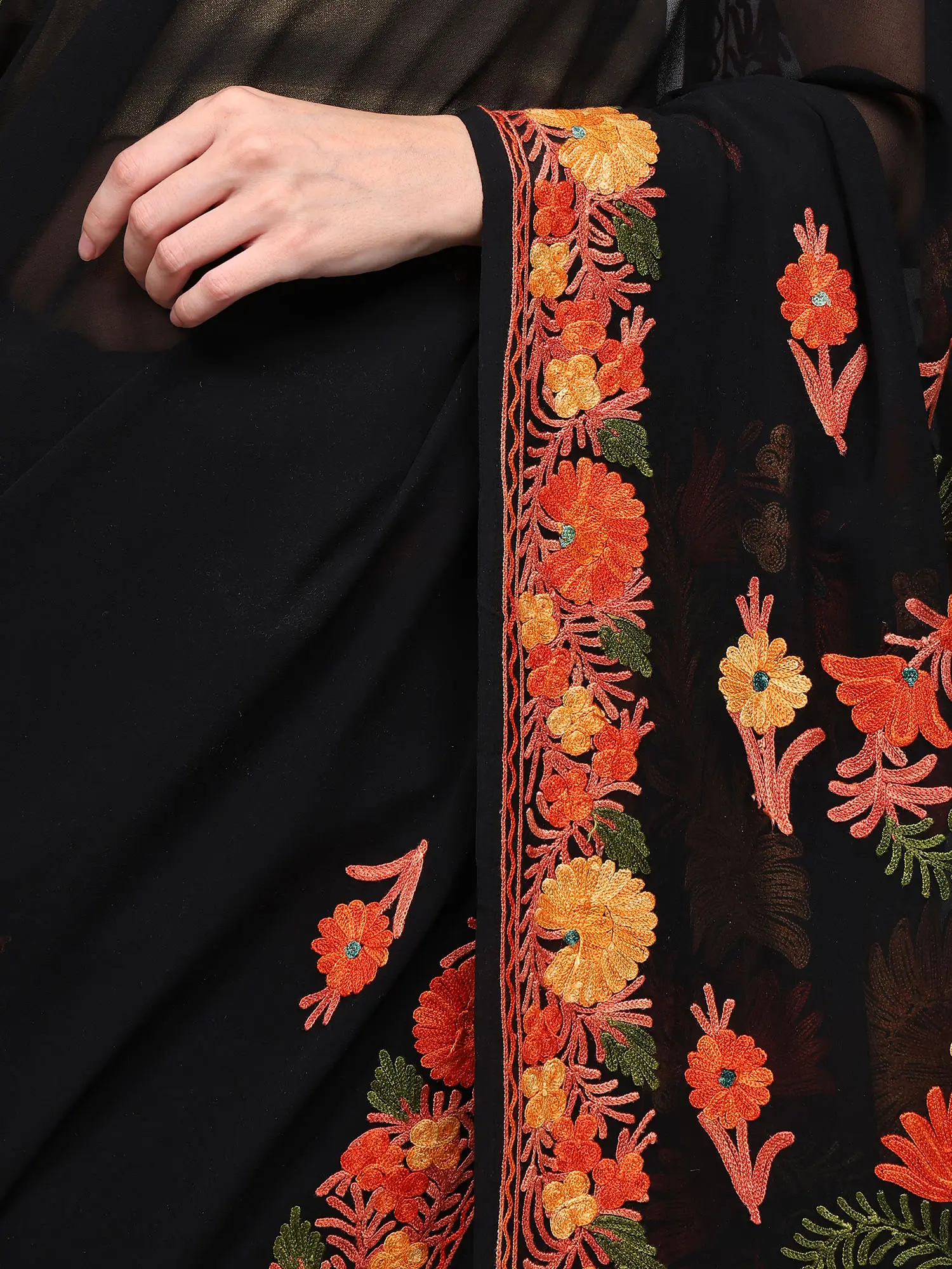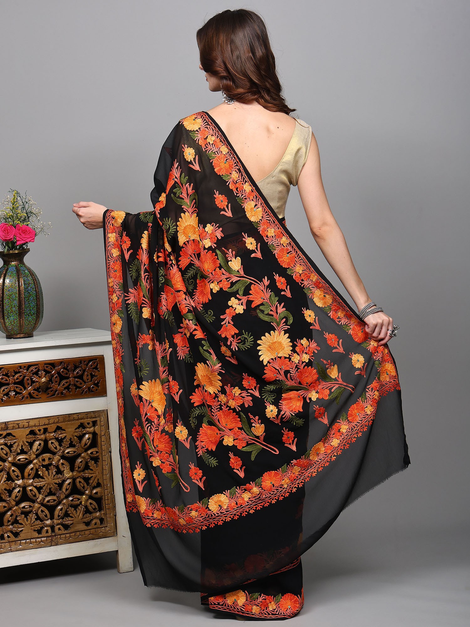 Jet-Black Georgette Saree with Aari Embroidered Floral Vines from Kashmir
