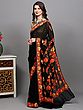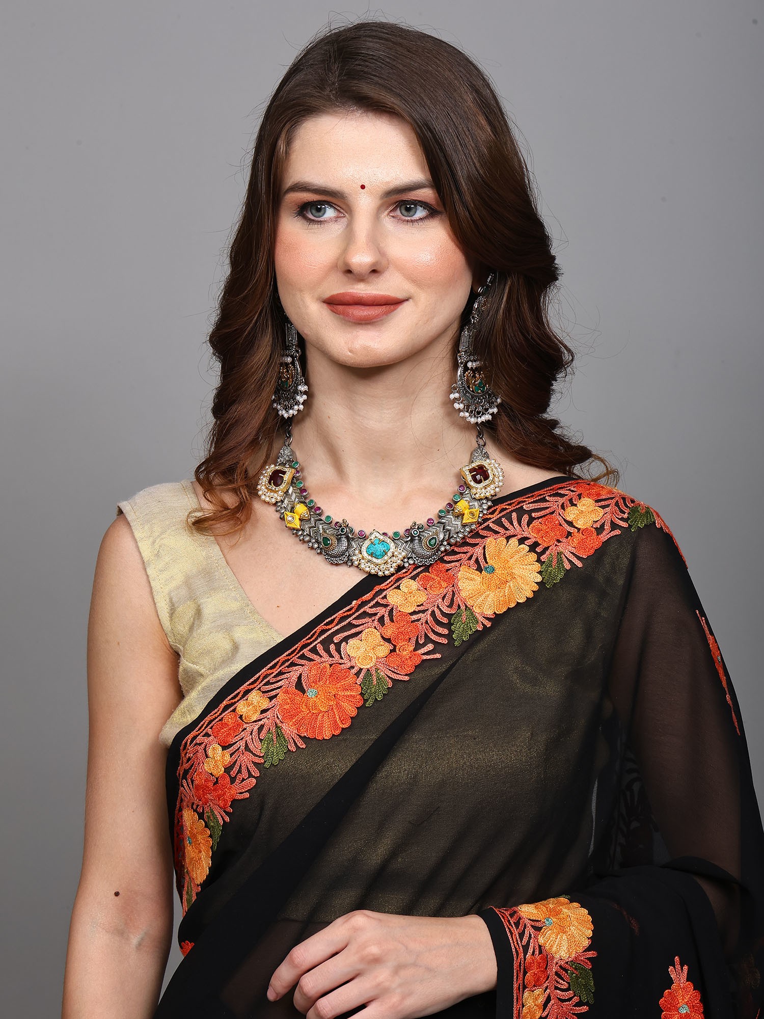 This georgette saree is a versatile addition to any wardrobe, perfect for a wide range of occasions. Its striking combination of classic black and vibrant floral embroidery makes it suitable for weddings, festivals, parties, and other special events where you want to make a memorable statement. The elegance of the design ensures it will be appreciated in both traditional and contemporary settings. Pair it with statement jewelry, like the striking necklace and earrings pictured, and a complementary blouse to complete your stunning ensemble. The tailored blouse and underskirt ensure a perfect fit, allowing you to move with confidence and grace.