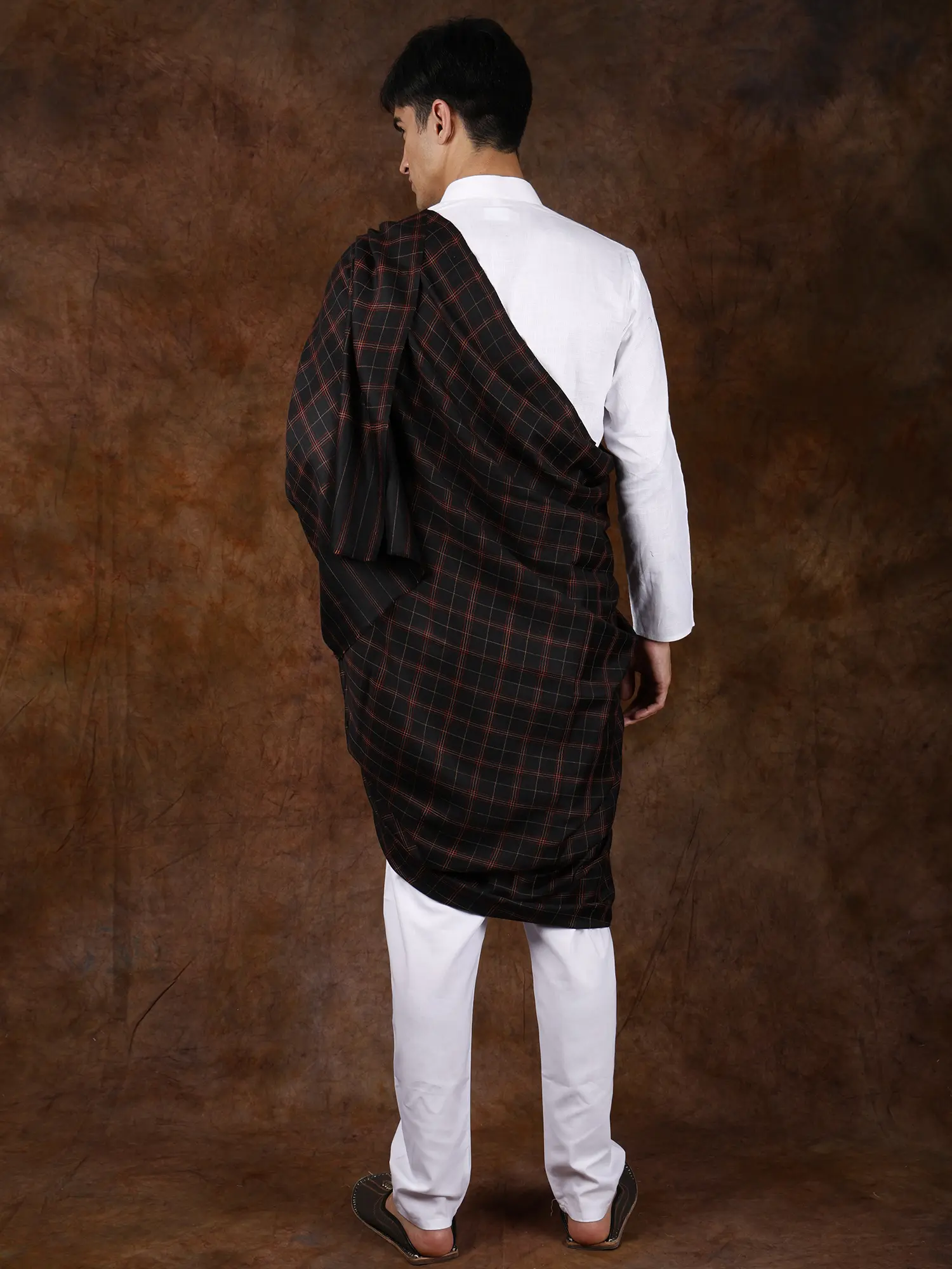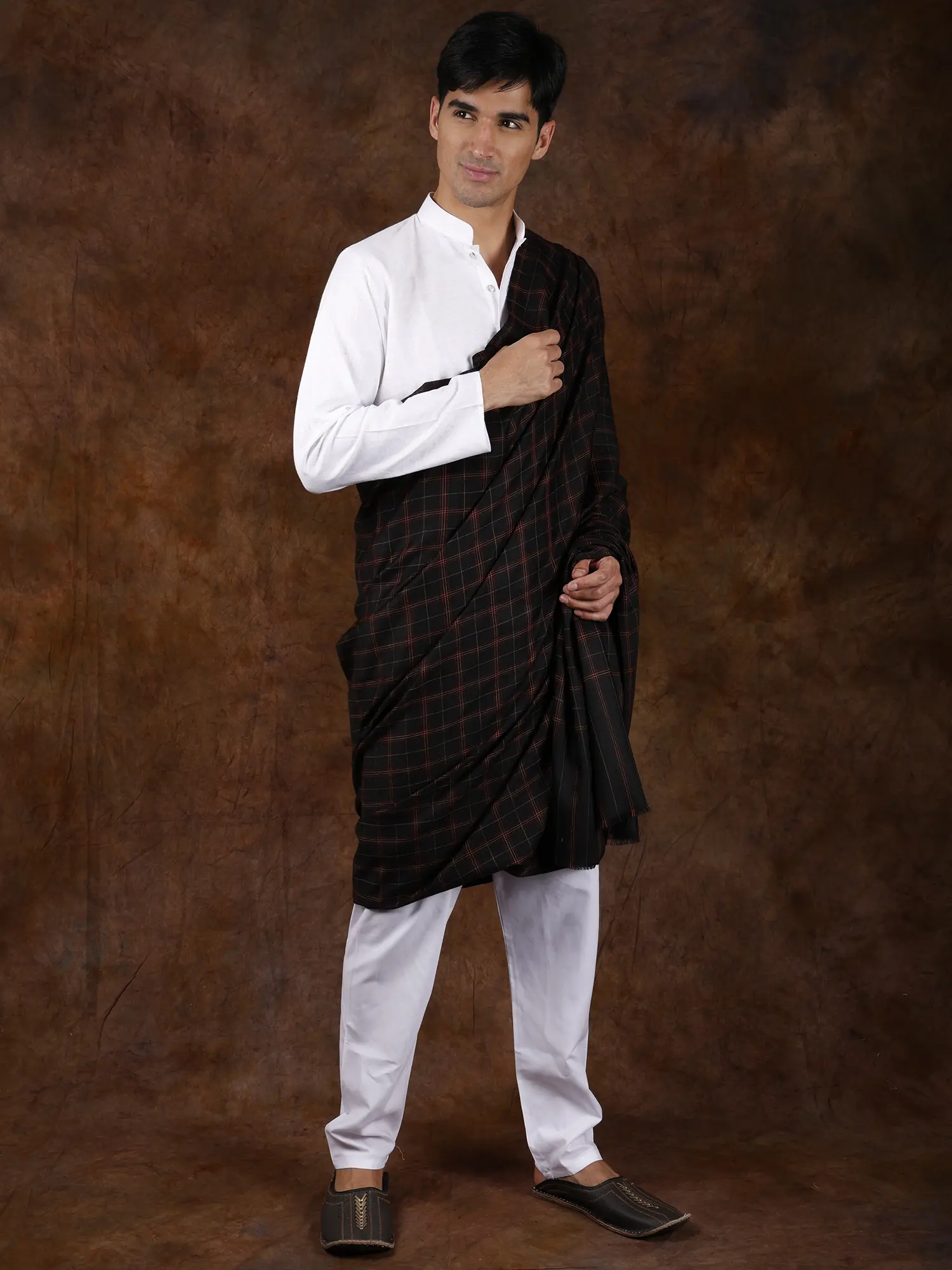 The deep, rich jet-black base of the shawl serves as a canvas for a classic woven plaid pattern. Subtle yet striking threads of complementary color are interwoven to create a timeless design that exudes understated elegance. The intricate plaid, a symbol of heritage and tradition, adds depth and character, making this shawl a versatile addition to any wardrobe. Its sophisticated color palette ensures it complements a wide range of outfits, from traditional attire to more contemporary ensembles.