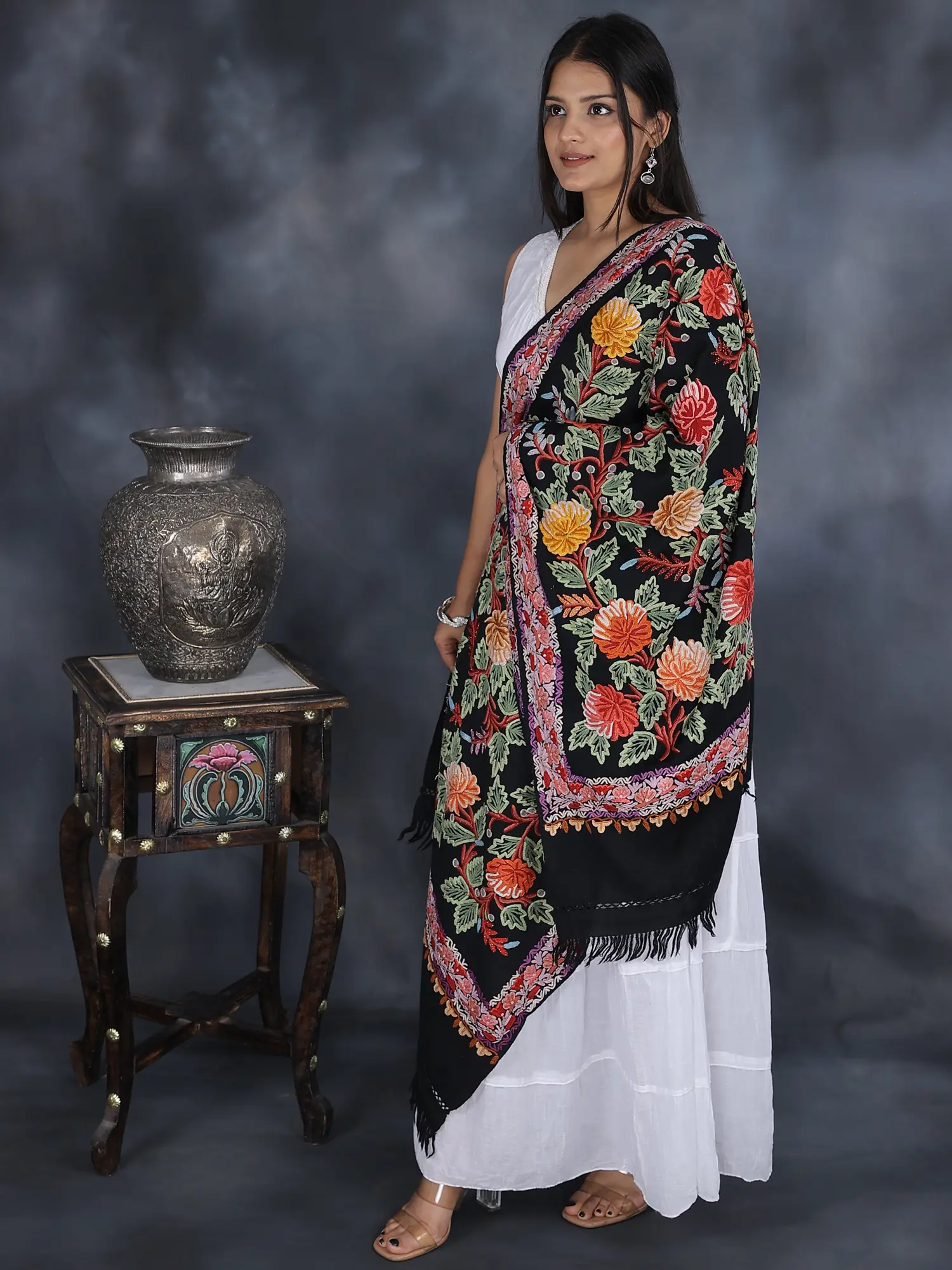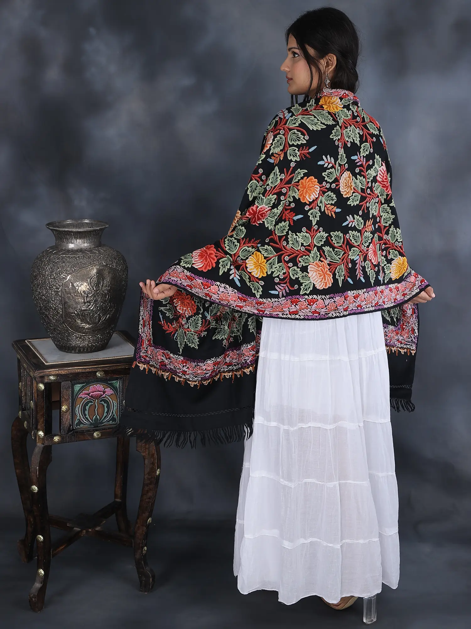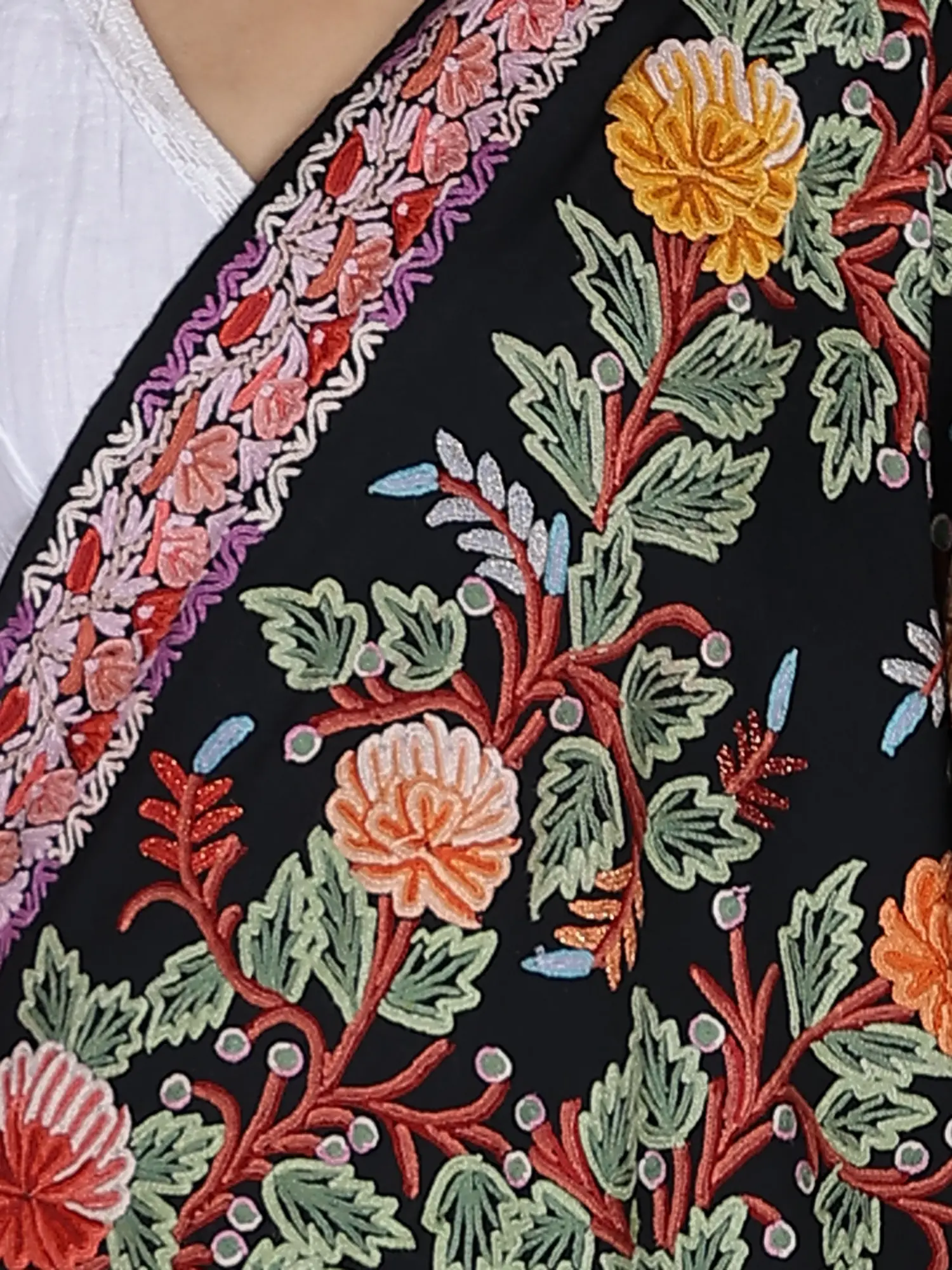 Drape this exquisite Jet-Black Stole from Kashmir, embedded with Aari Hand-Embroidered Foliage. The design traces its origins to the Mughal era, where it adorned the garments of royalty. The intricate foliage patterns, painstakingly created by skilled artisans radiate the region's rich heritage through their presence. Each delicate stitch captures the essence of the lush Kashmiri landscape. Against the jet-black canvas, the hand-embroidered foliage stands out with timeless elegance. This stole seamlessly combines tradition with contemporary style, making it a precious piece that transcends fashion trends, embodying Kashmir's artistic legacy.