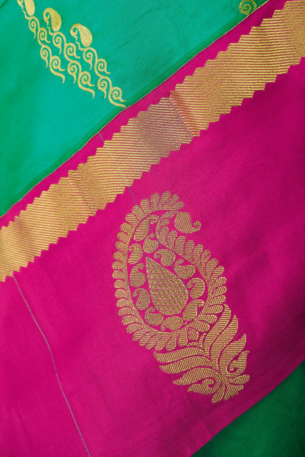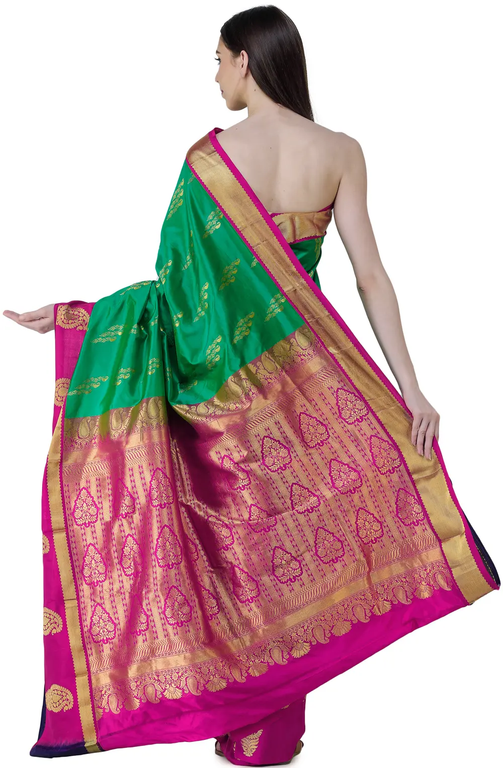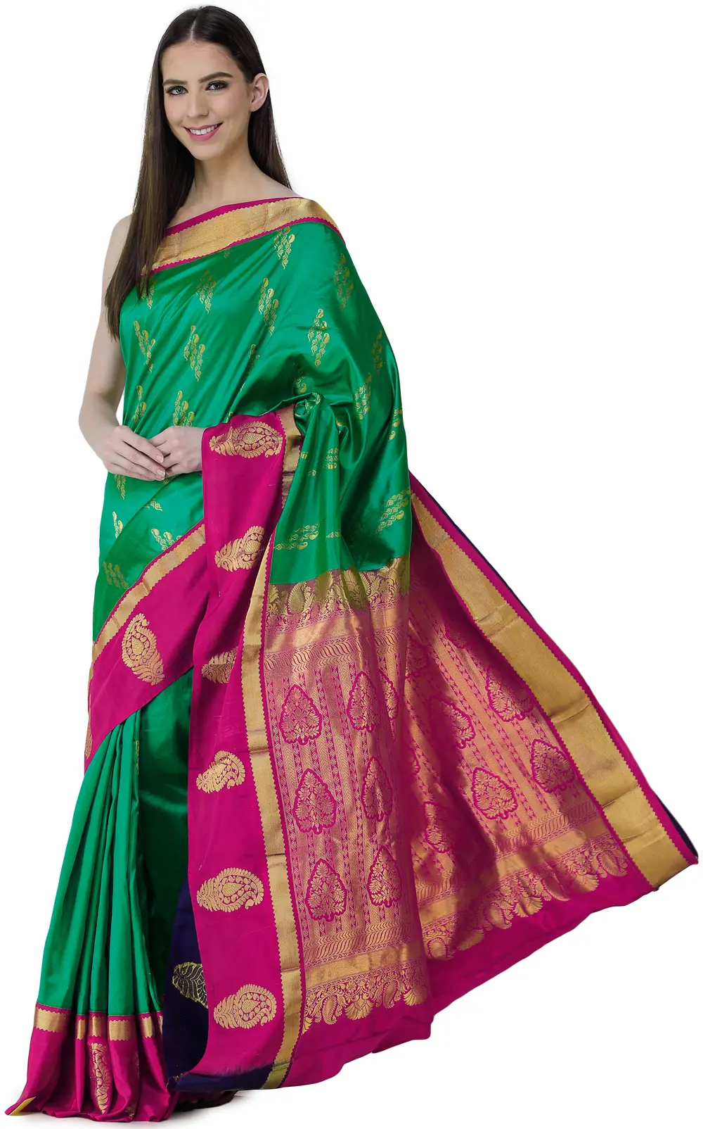 Vibrant-Green Pure Silk Saree from Bangalore with Golden Thread woven Contrast Wide Border