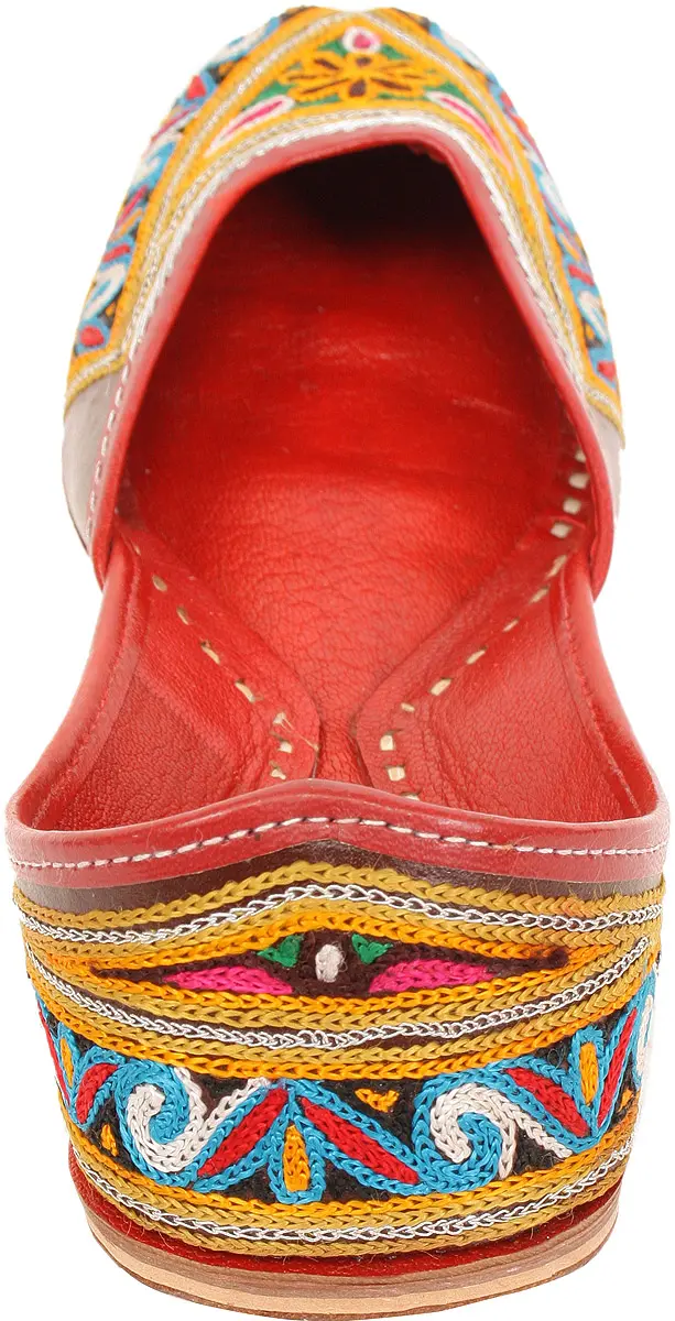 Indian traditional footwear, known as Jutti, has been around since 200 BC. From being a typical footwear brand, Jutti's has transformed into a custom-made, ethical essential. They are spherical or M-shaped and cover the front portion of the feet. This Jootis with Floral Aari-Embroidery in Multi-Color Thread carries forward the traditional craft. It is made of leather that has been painted in a bright red color. The colorful aari work on the red leather base creates a spring-like view and generates happy vibes. This Jutti is the perfect footwear to go with a bright shalwar kameez or saree.