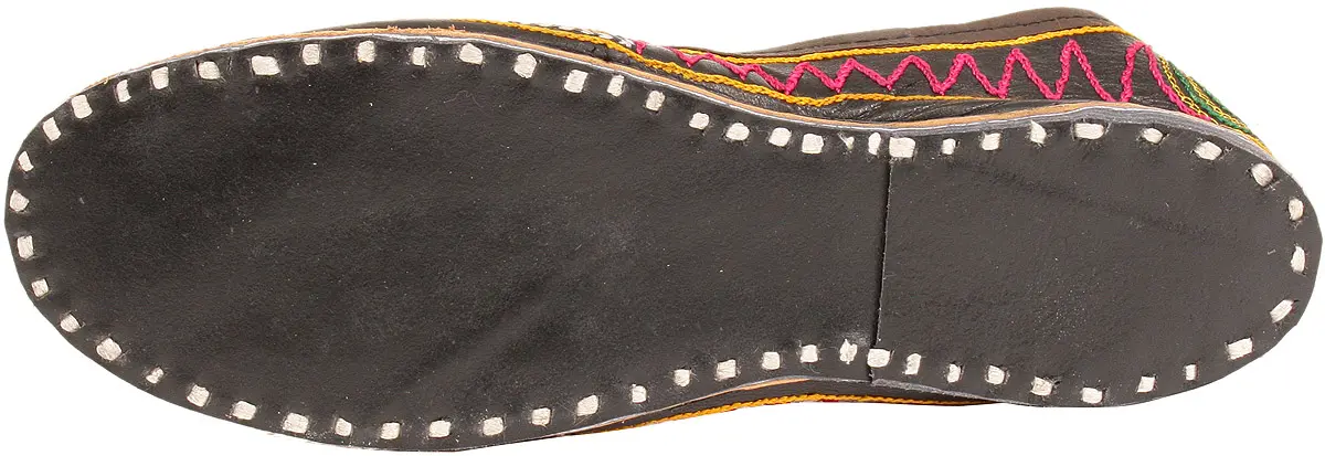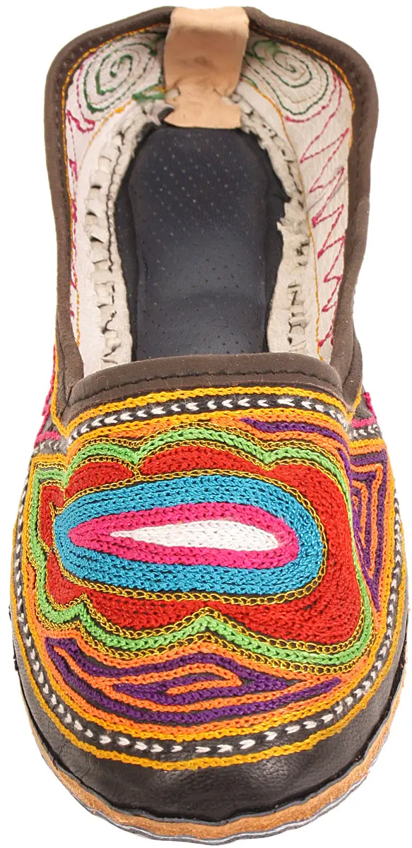 This Jootis with Hand-Embriodered Paisley is a unique piece of footwear that has been created with black printed leather. The multicolored Aari work with the paisley motif creates a serene view of a paisley garden aptly fitting traditional attire. The beautiful patterns embroidered on the juttis are reminiscent of the beauty of nature that has been utilized again and again to enhance the look of a daily-use object.