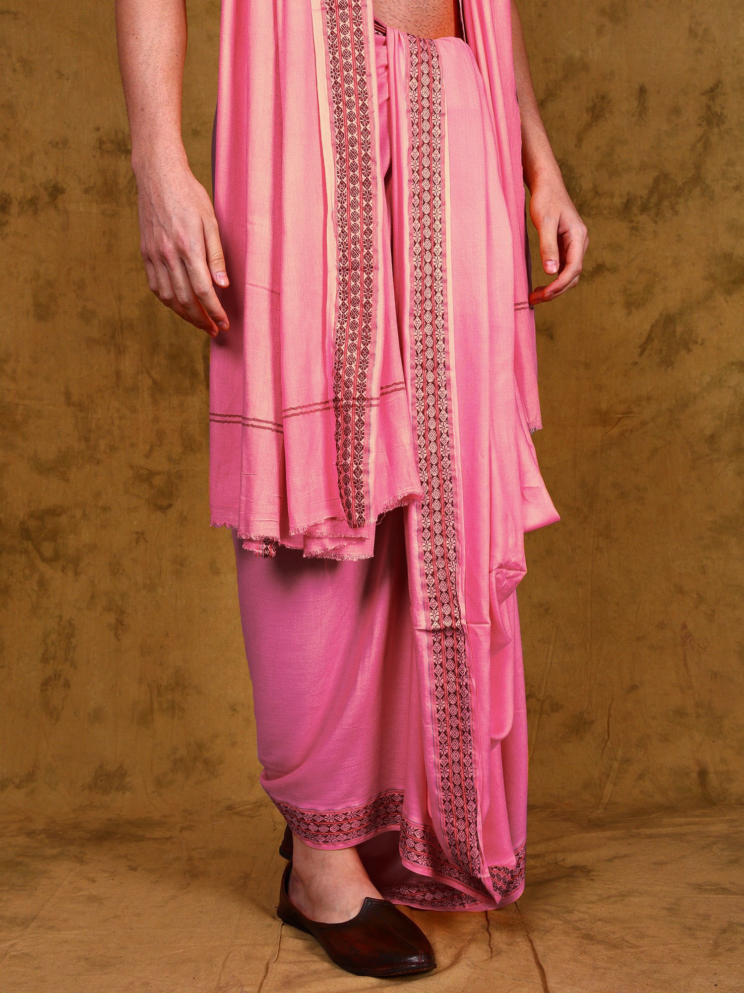 This dhoti and angavastram set is not only visually stunning, but also incredibly comfortable. The lightweight, breathable jute fiber ensures that you remain cool and at ease throughout the day, regardless of the occasion. The carefully designed drape of the dhoti allows for a graceful and elegant silhouette, while the angavastram adds a touch of sophistication and cultural significance. Whether you're participating in a religious ceremony, attending a special event, or simply seeking a comfortable and stylish outfit for everyday wear, this set is the perfect choice.