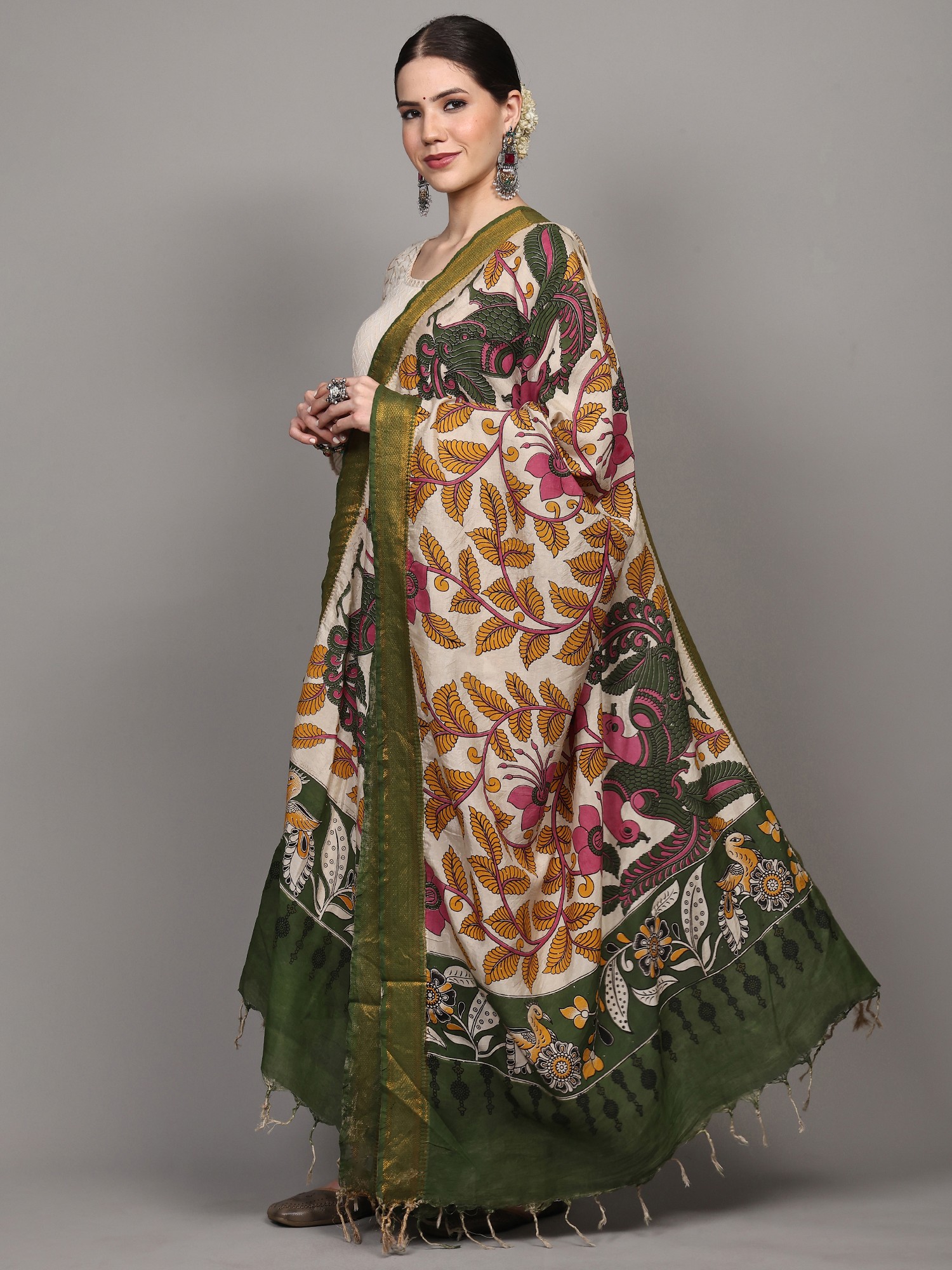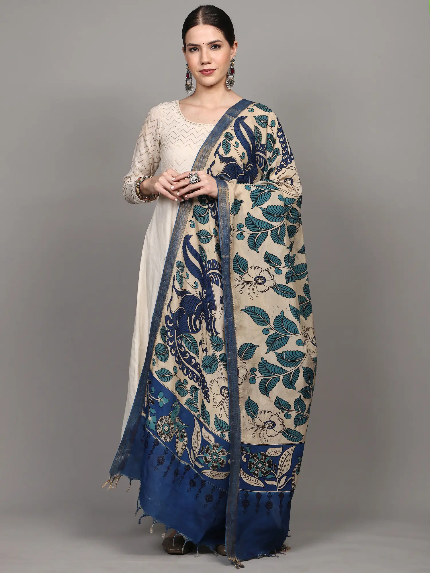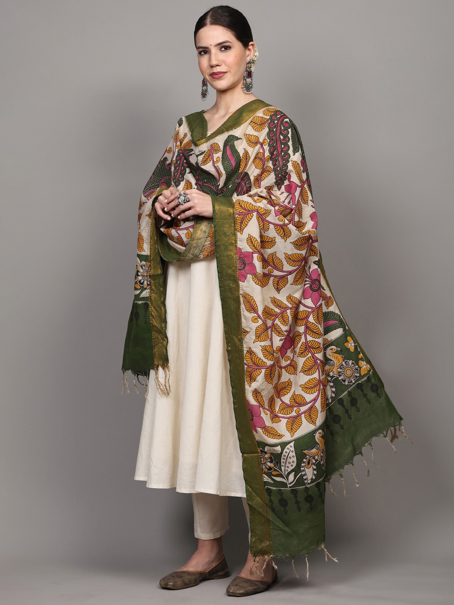 Cannoli-Cream Aari Embroidered Kalamkari Stole with Printed Multicolor Paisleys-Flowers Motifs from Punjab